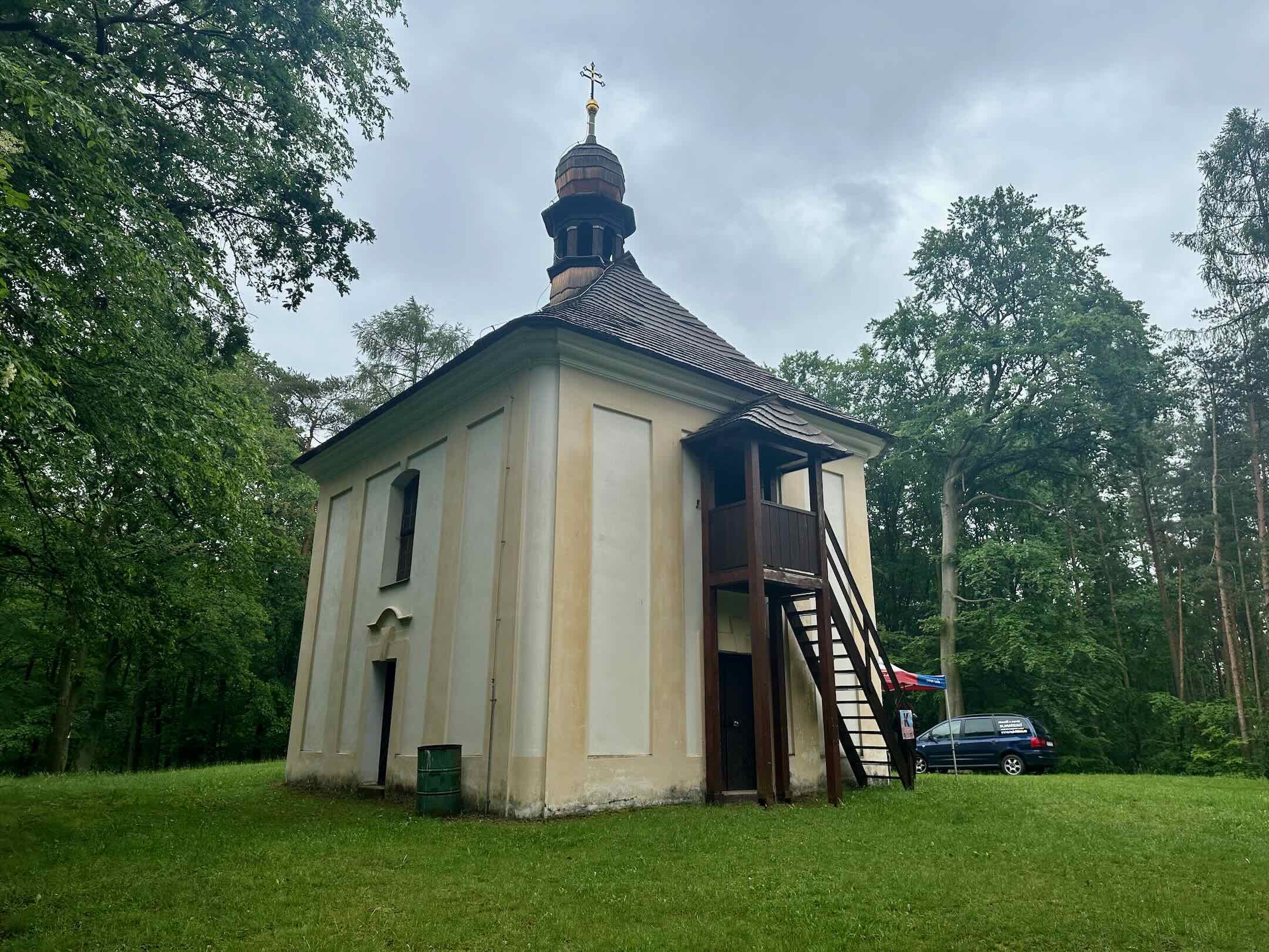 Kousek před koncem seběhu k Vejvanovskému potoku je takové malé zpestření – zhruba metr vysoký tunel skrz hustou vegetaci tvořenou vesměs trnitými keři, z prudkého kopce a s klouzavým blátem na zemi. Přemýšlím, jestli polezu po čtyřech nebo risknu roztrhání batůžku… Nakonec se nějak skrčím a protáhnu, ale nohy si to moc neužívají a i na rukách přibylo pár škrábanců. O chvilku později křížím silnici a začínám stoupat k další občerstvovačce, tentokrát u kaple sv. Václava. Bývá to moje nejoblíbenější, je tam klid a velmi milé organizátorky, ale letos to asi bude trochu smutnější.