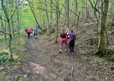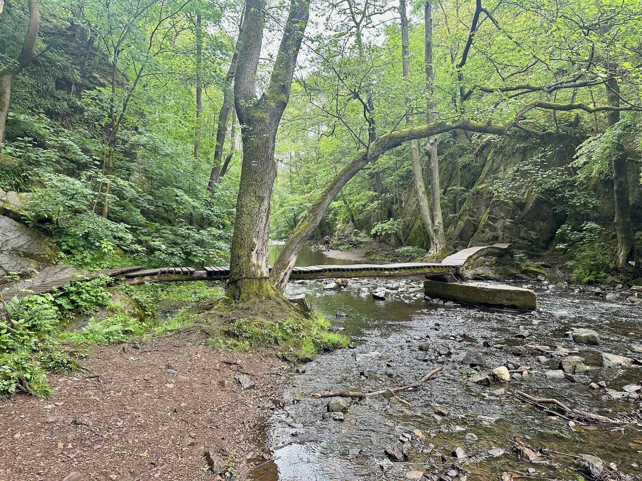 Po břehu potoka Radubice to je hodně do kopce, ale zatím mi to šlape. Pár minut po návratu na červenou značku doháním dalšího pochodníka, který má na lýtku vytetovanou dánskou vlajku. Na mojí otázku „Jak to jde“ odpoví „Sorry, no Czech!“. OK, tak teda po anglicky. Dozvídám se, že je z Dánska, je tu už tři roky, jmenuje se Henrik a dělá tu ve společnosti Lego. Rakovnickou už jde po několikáté, ale poprvé stovku. A momentálně si užívá gulášovku, kterou usrkává ze silikonového kelímku. Ještě chvilku povídáme, ale nedostatek kyslíku cestou do kopce má vliv na mou slovní zásobu, tak se loučím a přitápím pod kotlem.