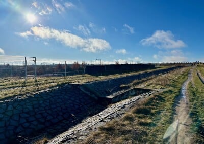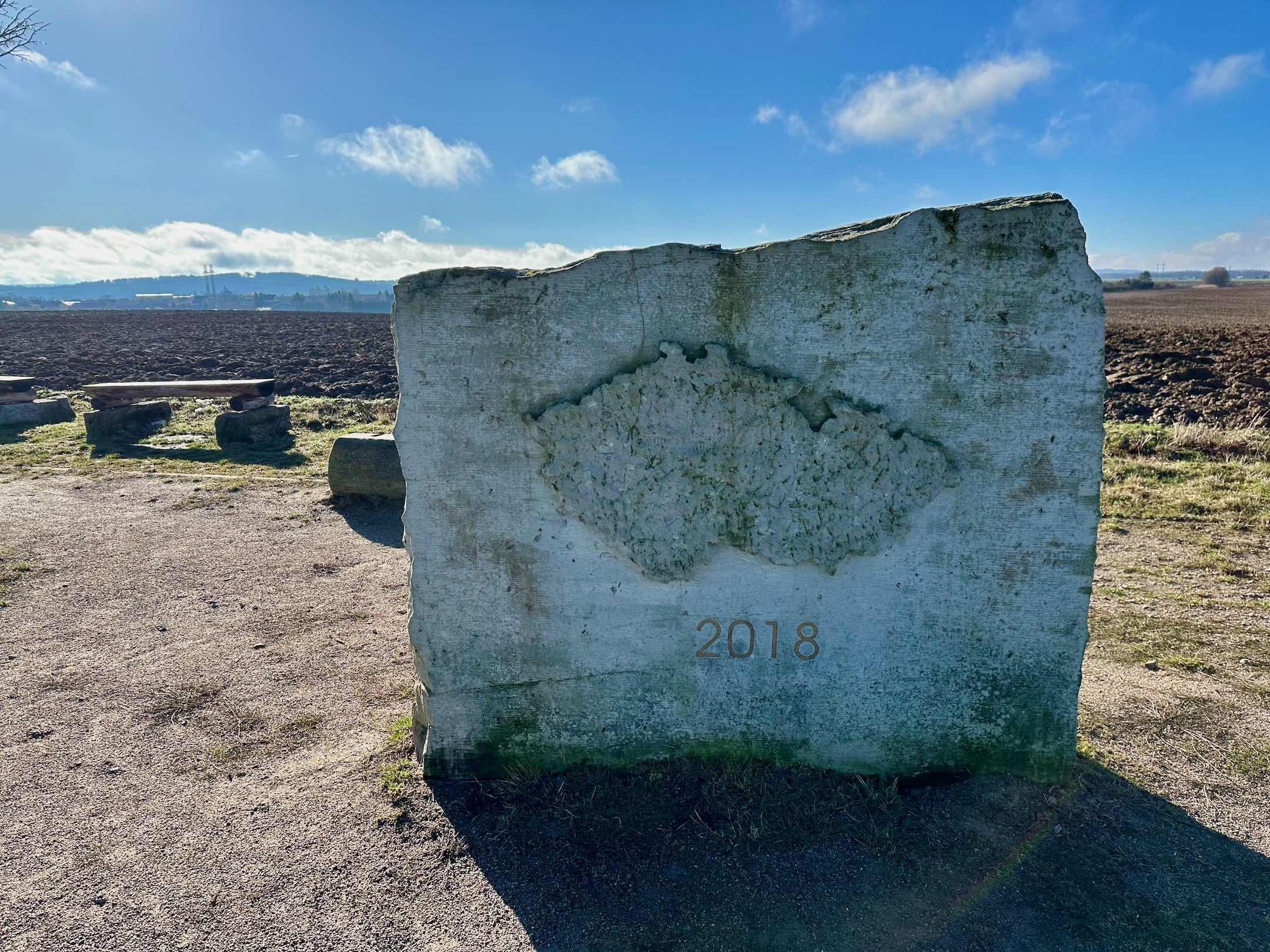 Z informační tabule si fotím celkovou délku cyklotrasy 19A, pak skrz klidné ranní Dolní Břežany pokračuju dál na jih. Mezi zoranými poli mi to přijde povědomé, tady už nějaký pochod určitě vedl. A taky že ano, dokonce ten samý, akorát o pár let zpátky. V zatáčce plním další samostatný úkol a fotím si plastiku České republiky vytvořenou v roce 2018 ke 100. výročí založení Československa. Po průchodu obcí Libeň dávám vale méně záživné části pochodu, dál už to bude víc přírodní. A bahnité…
