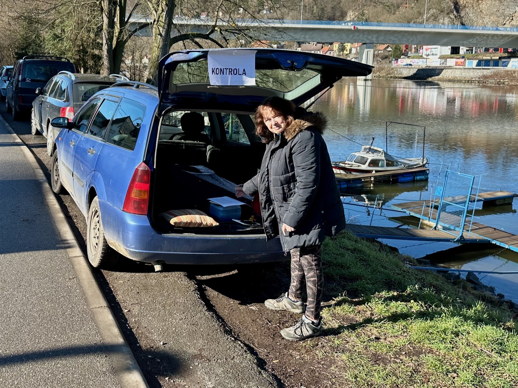 Přibíhám k Zahořanskému potoku a podél něj vyklusávám chatařskou oblastí až k Vltavě. To už jsem až na pátém místě, předběhl mě nějaký borec v bílém. K další živé kontrole a nejjižnějšímu místu trasy mi zbývá pár stovek metrů. Kousek od nádražní budovy stojí modré auto s otevřeným kufrem a přilepenou cedulkou KONTROLA. Zdravím se s paní kontrolorkou a podávám jí kartičku, kam mi obratem vtiskne další razítko. Mezitím si z batohu vyndavám rohlík se sýrem a šunkou a k tomu velkou lahev iontového nápoje. Loučím se a s plnou pusou se vracím po stejné cestě podél řeky zpátky, kde potkávám další dva závodníky přibíhající o pár minut později.