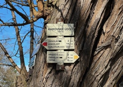Mezi poli a po okraji lesa míří mé další kroky k rozcestníku Ohrobská, kde máme v rámci další samokontroly opsat letopočet ze zarezlého a zarostlého turistického ukazatele. Ani jsem netušil, že tu nějaký takový je. Tady už je to jinak hlava na hlavě, při seběhu po červené se vyhýbám asi 20 lidem, což mě poněkud zpomalí. Břicho už je lepší, daří se mi klusat už přijatelnou rychlostí. Na železniční zastávku Jarov tak dobíhám s mírným optimismem.