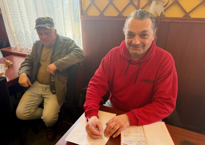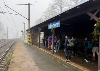 Startuje se v 7:45 z Všenor, ale cíl bude v Řevnicích. Tak jsem pro co nejpohodlnější pozávodní cestu domů mířil právě tam. Cesta byla v pohodě, provoz slabý, za 45 minut jsem byl na místě. Zaparkoval jsem na parkovišti před nádražím, koupil si v mobilu jízdenku a 10 minut poté nastoupil do vlaku, který mě dovezl až na start. Tam už bylo několik pochodníků a dva stolečky s organizátory. Zaplatil jsem 80 korun, dostal itinerář a začal se připravovat na start.