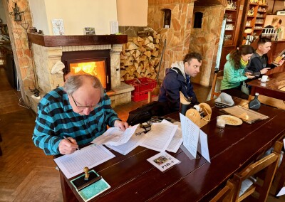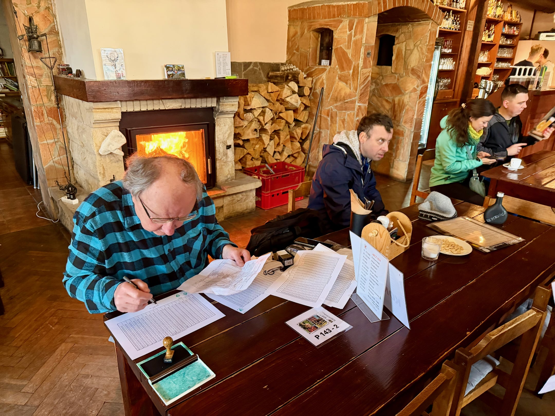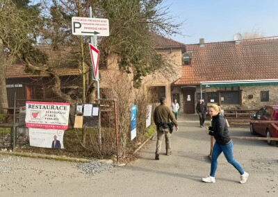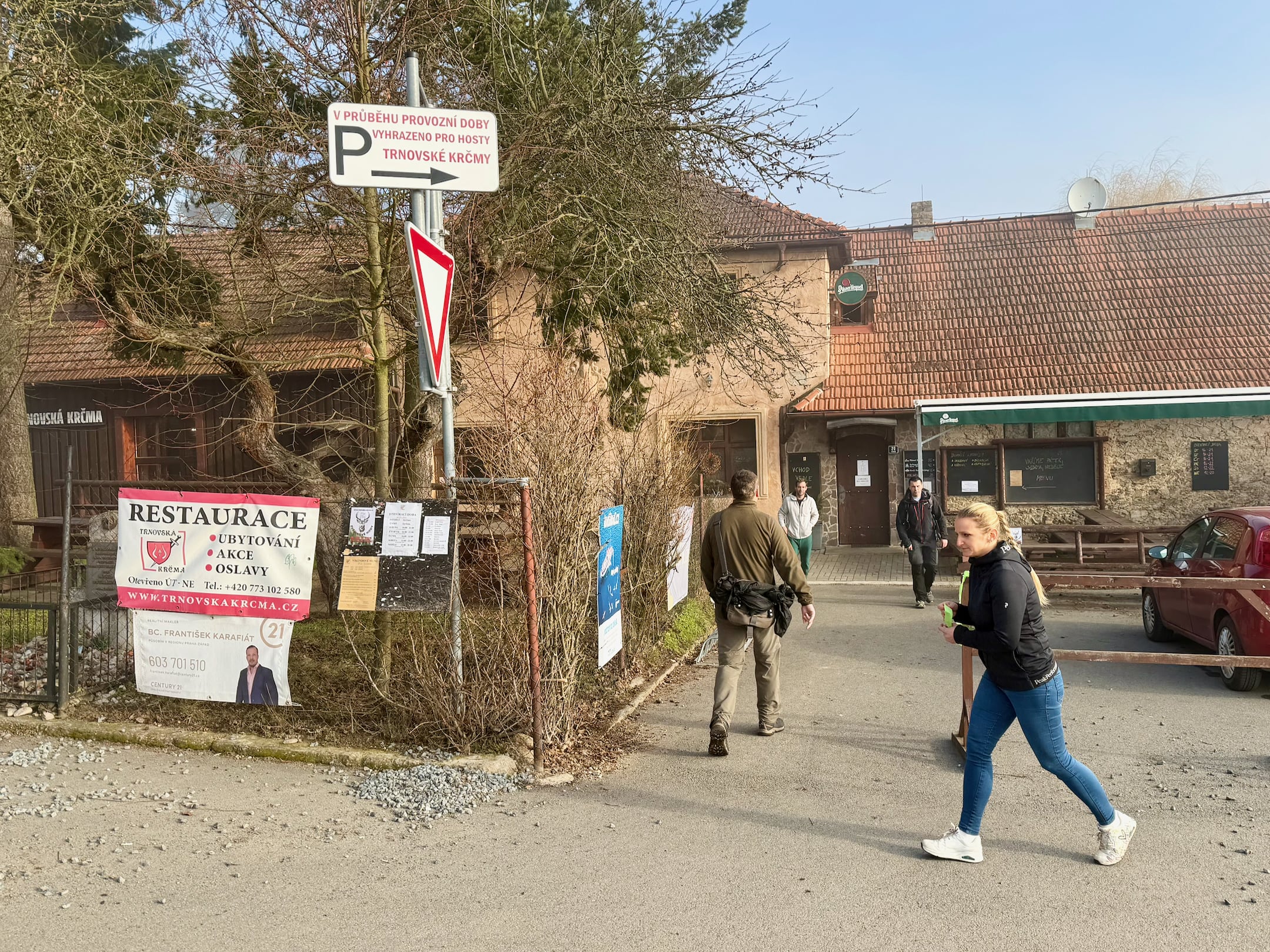 Zhruba 45 minut po startu se mlha rozpouští, k první živé kontrole v Trnovské krčmě v obci Trnová přibíhám už za plného sluníčka. Dostat razítko do kontrolní karty trvá jen pár vteřin a vzápětí vyrážím na další část pochodu.
