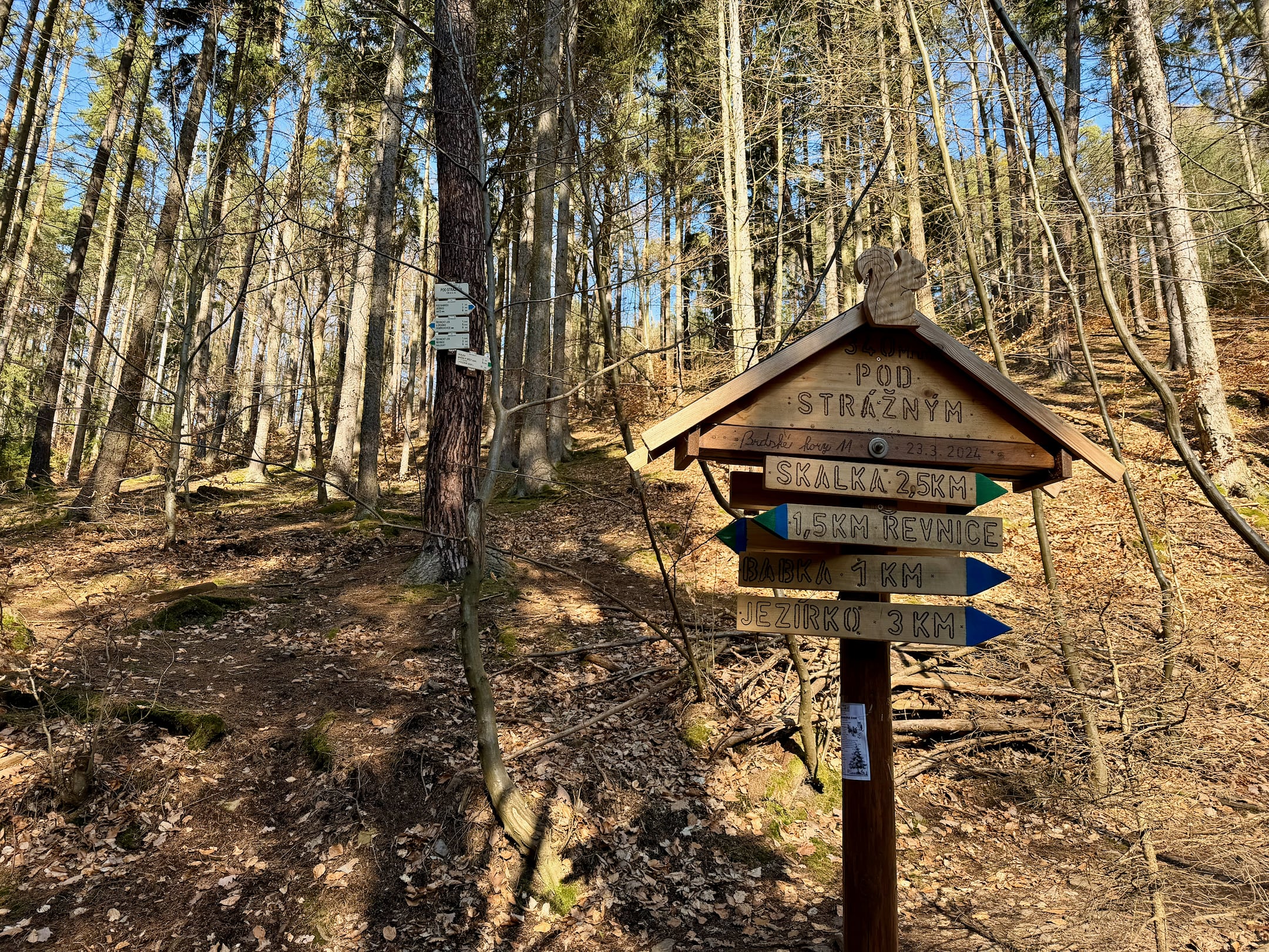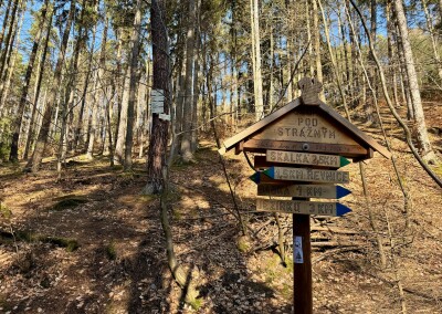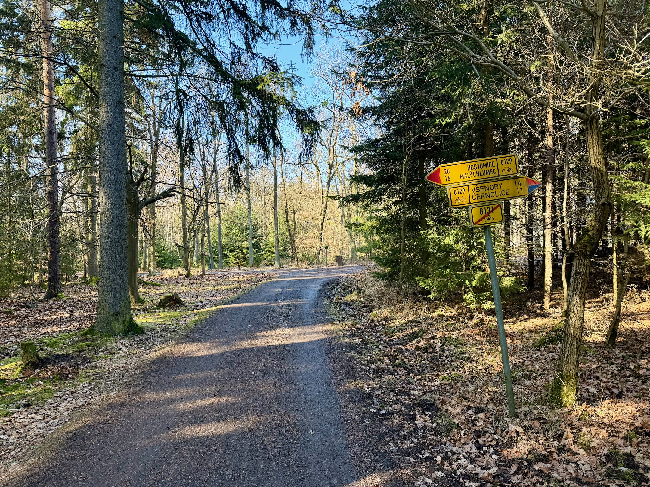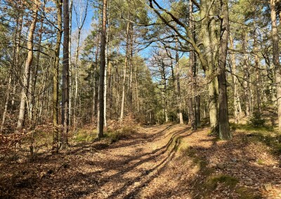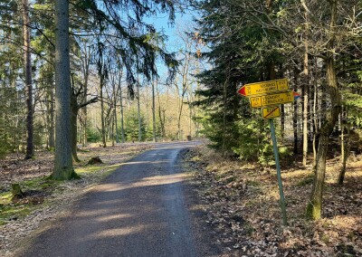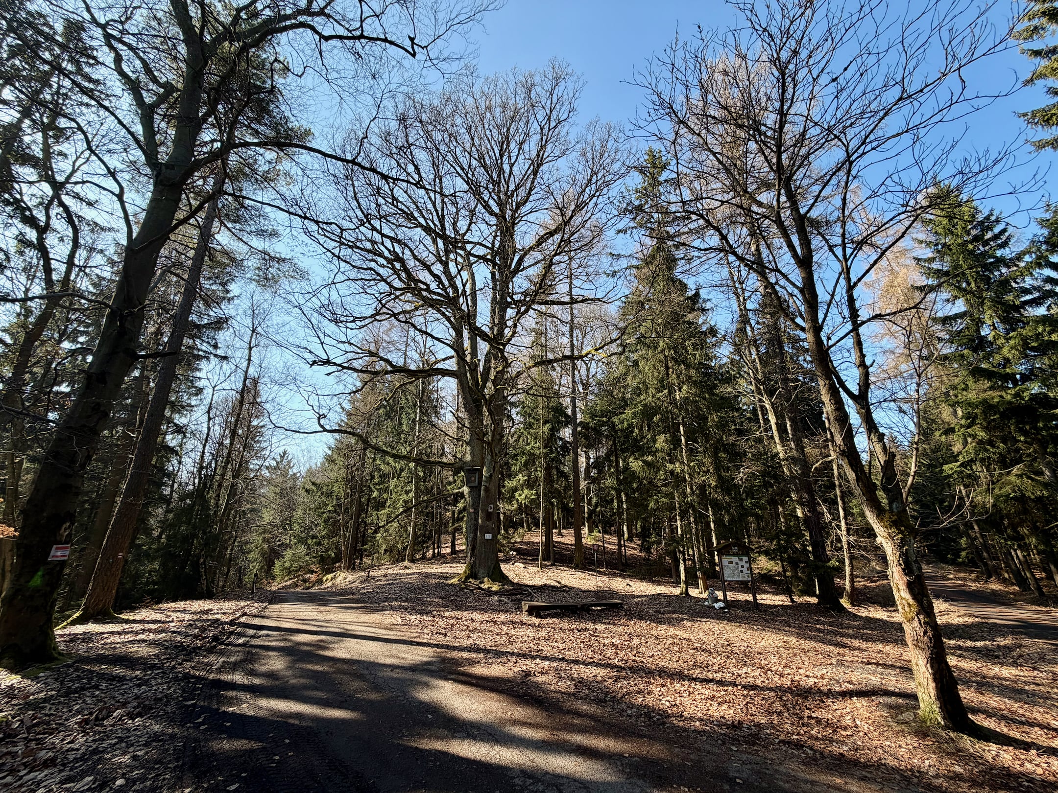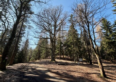 Lesní cesta kolem Stožce je asi nejvíc podmáčená z celého pochodu. Nechci si nabrat, tak opatrně skáču z kořene na kořen. U bývalého vojenského prostoru Klondajk se to ale zlepší a dál už je to zase v suchu. Fotím si mohutný Třebízského dub a na rozcestí Na Soudném i další odpověď na kontrolní otázku.