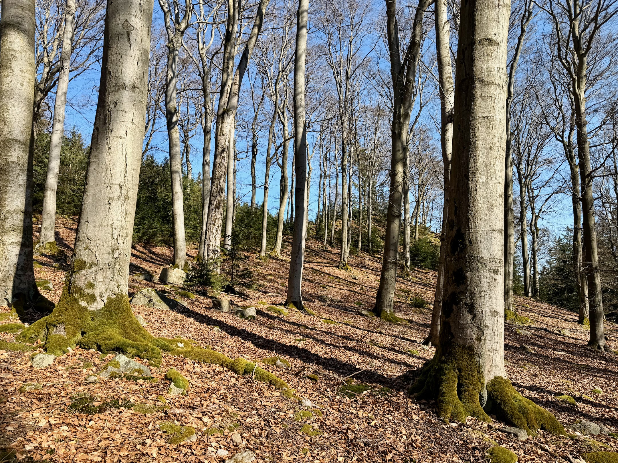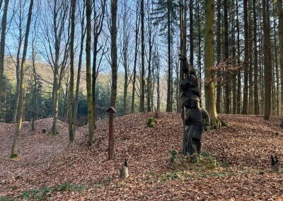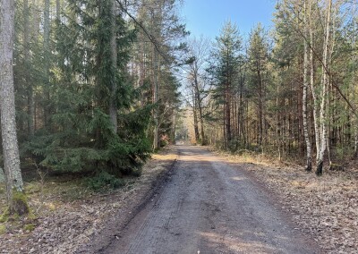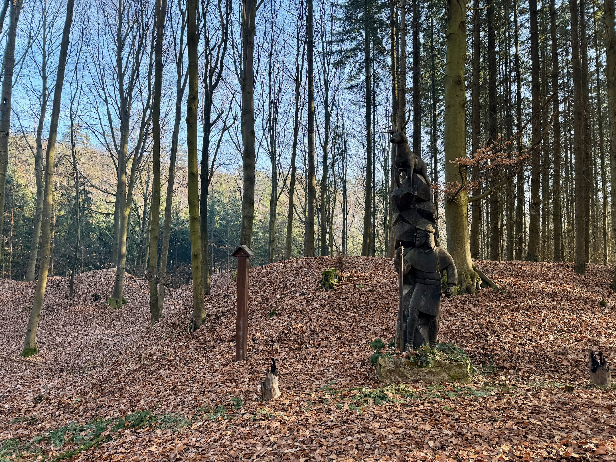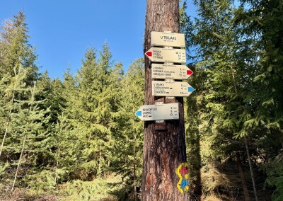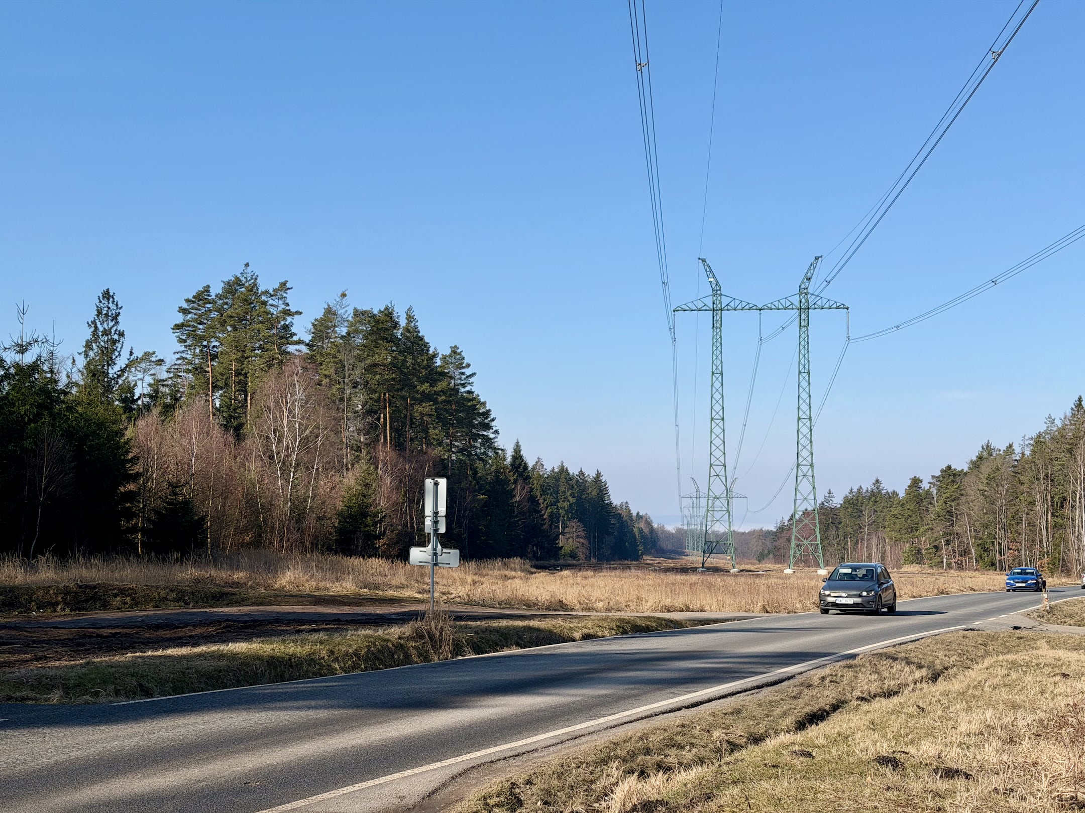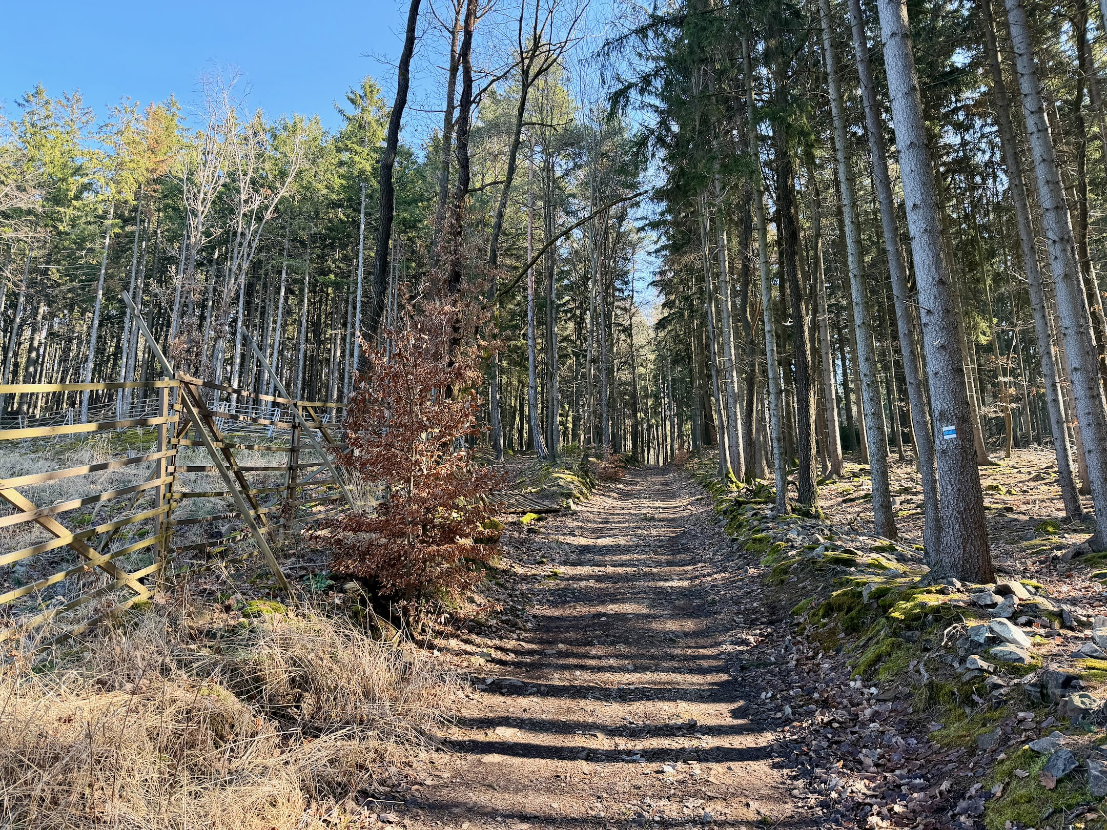Lesní cesta kolem Stožce je asi nejvíc podmáčená z celého pochodu. Nechci si nabrat, tak opatrně skáču z kořene na kořen. U bývalého vojenského prostoru Klondajk se to ale zlepší a dál už je to zase v suchu. Fotím si mohutný Třebízského dub a na rozcestí Na Soudném i další odpověď na kontrolní otázku.