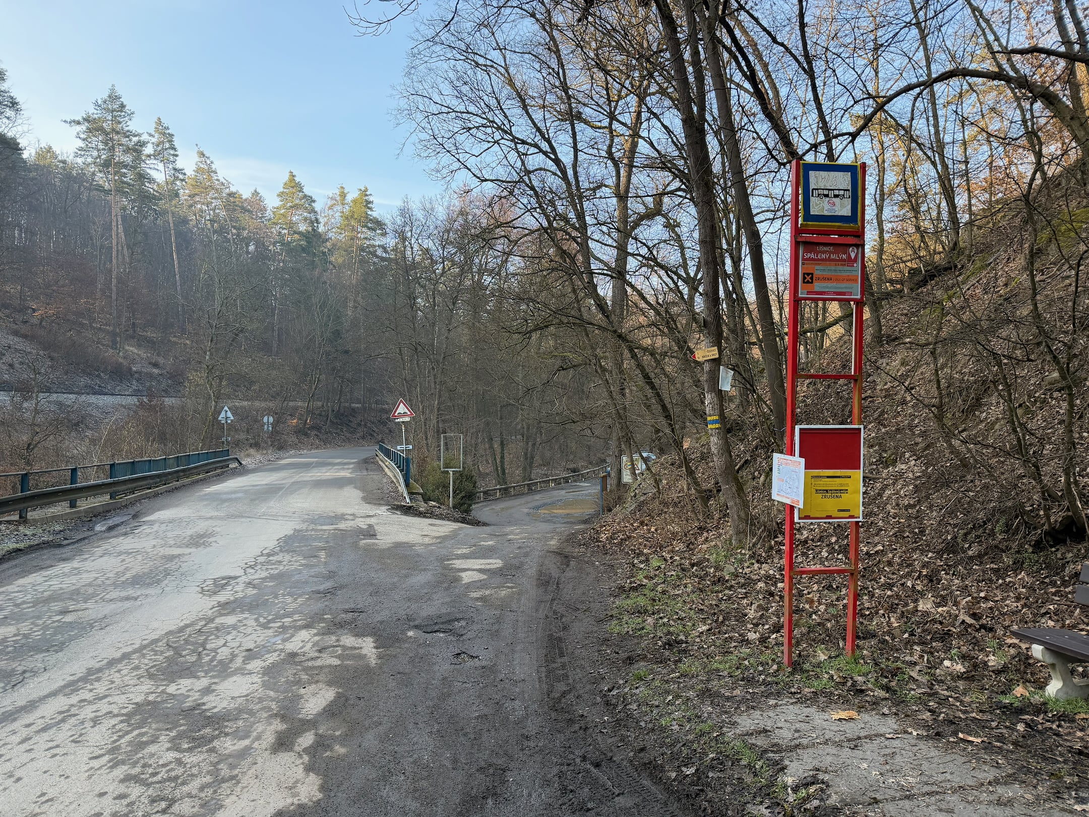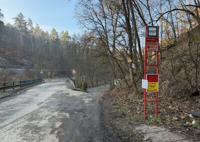 Na druhé samostatné kontrole u Spáleného mlýna fotím zrušenou autobusovou zastávku, pak pokračuju dál do vesničky Líšnice. Krátký asfaltový úsek si zjednoduším během po travnaté louce, podchodem dnes podruhé křížím dálnici D4. Jen proběhnu Řitkou a jsem zase v přírodě, v přírodním parku Hřebeny.