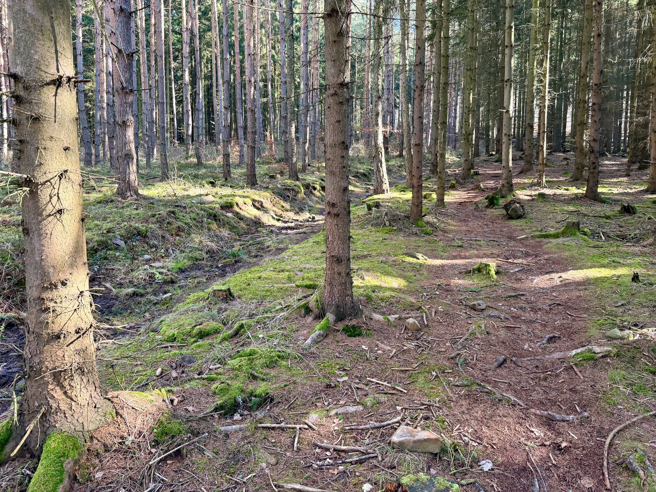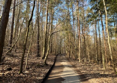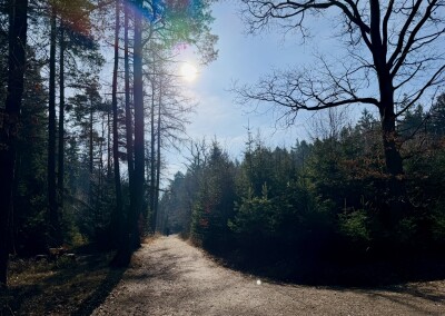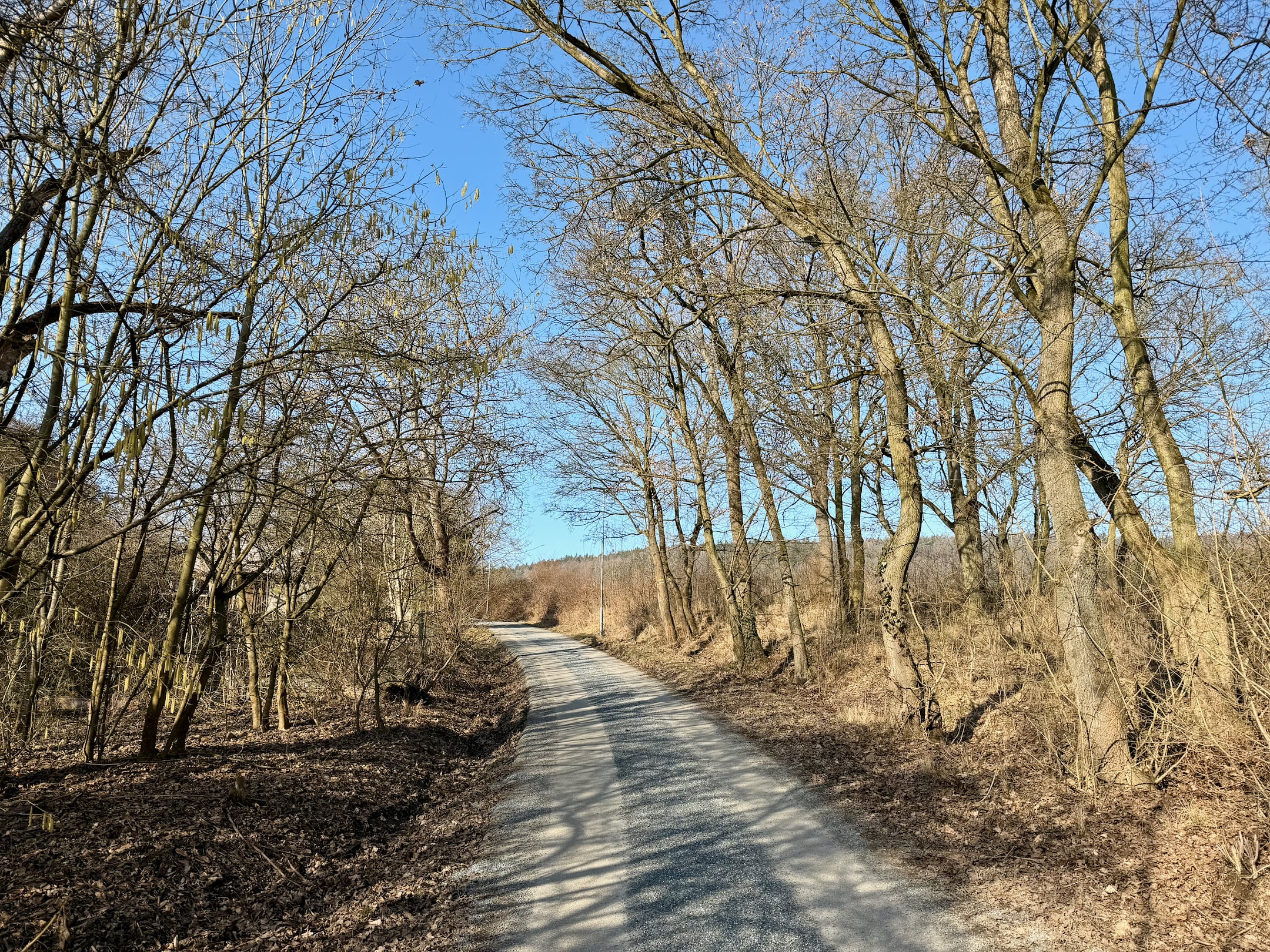 Dobrá zpráva je, že mě čeká asi 5 kilometrů příjemného výklusu z mírného kopce. Ta špatná je, že naprostá většina těch pěti kilometrů bude o asfaltu. Ale díky mým super extra tlumeným bačkůrkám od Hoky to pro mé nohy nepředstavuje žádný problém. Běžím, kochám se jarním lesem a je mi fajn.
