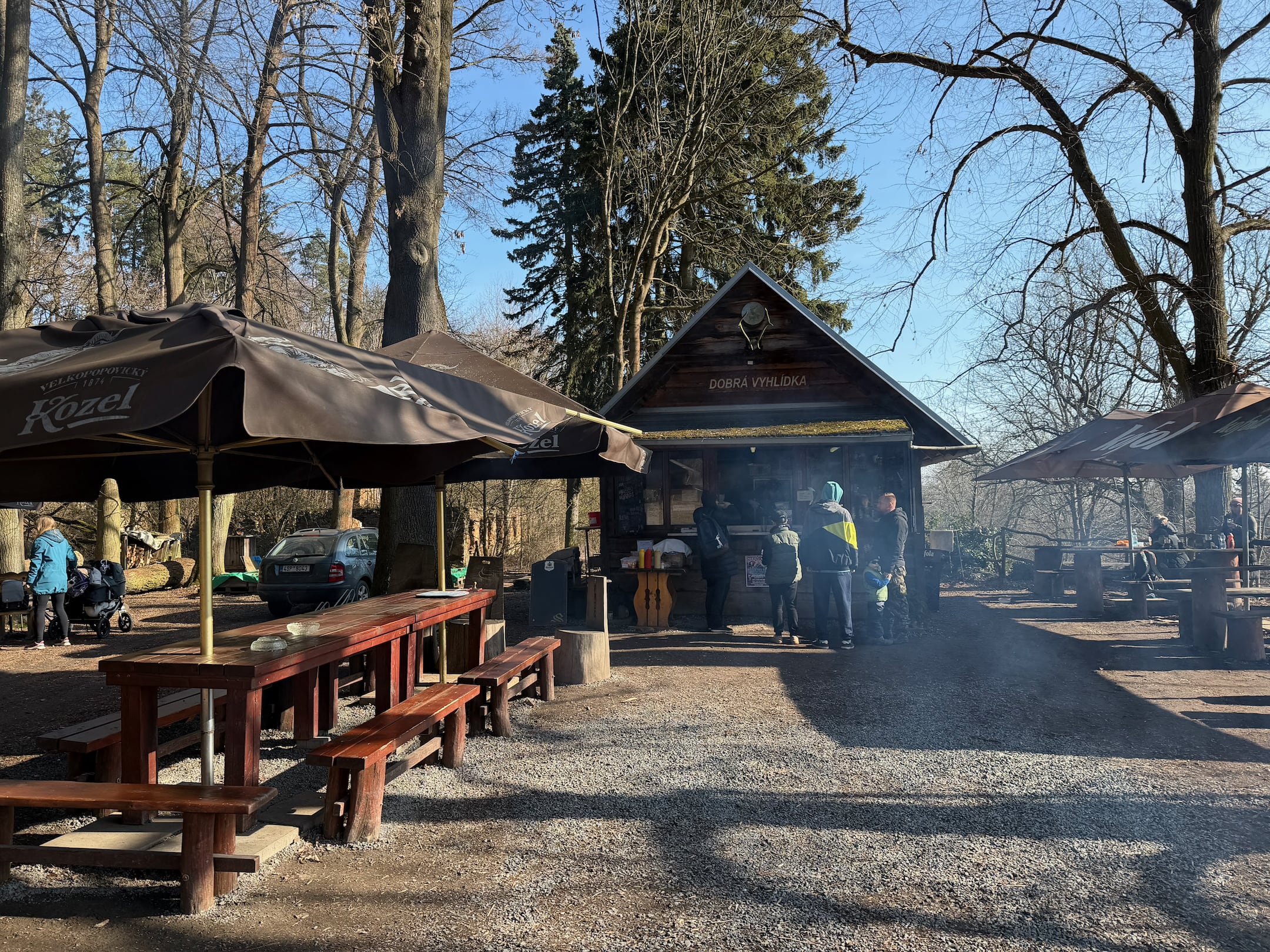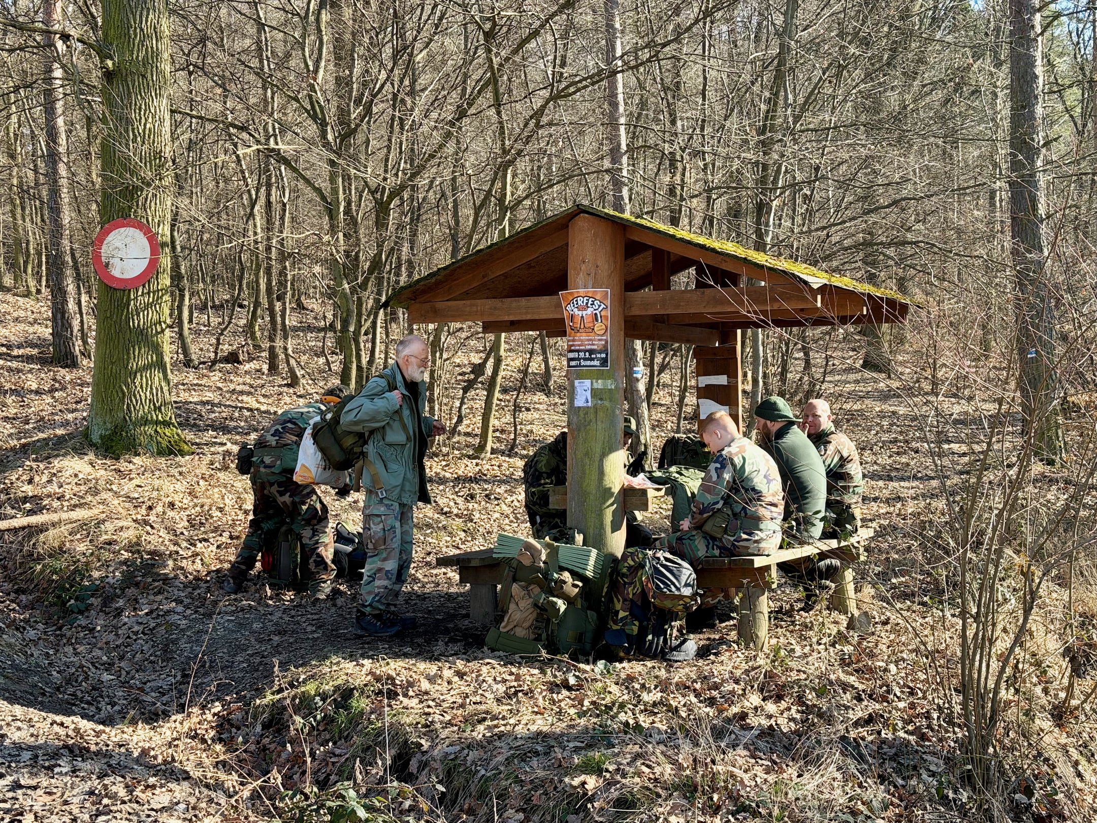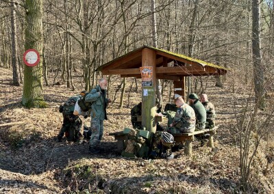 Na rozcestí u Stožce je další přístřešek okupovaný partičkou trempíků. Je jich tady požehnaně! Fotím si odpověď na otázku, komu zdejší lesy vesměs patří. Pohledem do mapy se ujišťuju v tom, že jsem skutečně na nejvzdálenějším místě letošního pochodu, dál už se budu jen vracet směrem ke startu (a cíli).