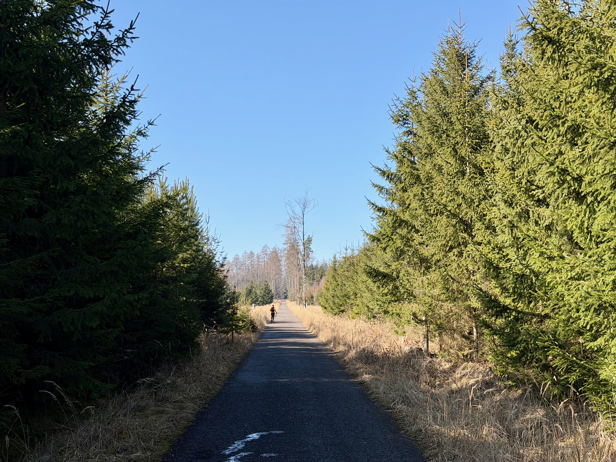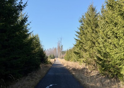 Postupně míjím Chouzavou a Voznici. Čeká mě nepříjemné, dlouhé a táhlé stoupání až na Stožec. Někde uprostřed mě předbíhá povědomá tvář, Hanka Váchová. Běží do kopce jako by to byla obyčejná rovinka! Za már minut mi mizí z dohledu a jsem zase sám.