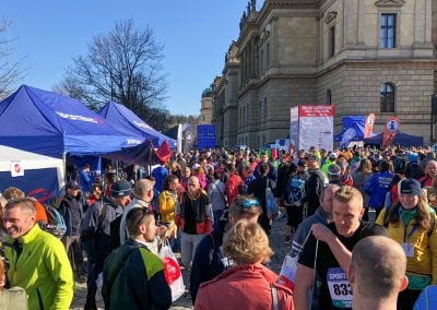 Už z dálky mě vítá hlasitá hudba a frenetický moderátor či moderátorka. Na náměstí to žije. Všude jsou davy závodníků, organizátorů i fanoušků. Jdu si prohlédnout prostor startu a cíle s červeným kobercem, pak se zařadím do fronty a po předložení startovního čísla mě organizátoři pouští do zázemí. Je tu všechno, co si prostý závodník může přát, a zatím relativně prázdno. Většina prostoru je bohužel ve stínu, takže klepu dost slušnou kosu, je pár stupňů nad nulou. Musím pořád popocházet, jinak by ze mě byla brzy kostka ledu.