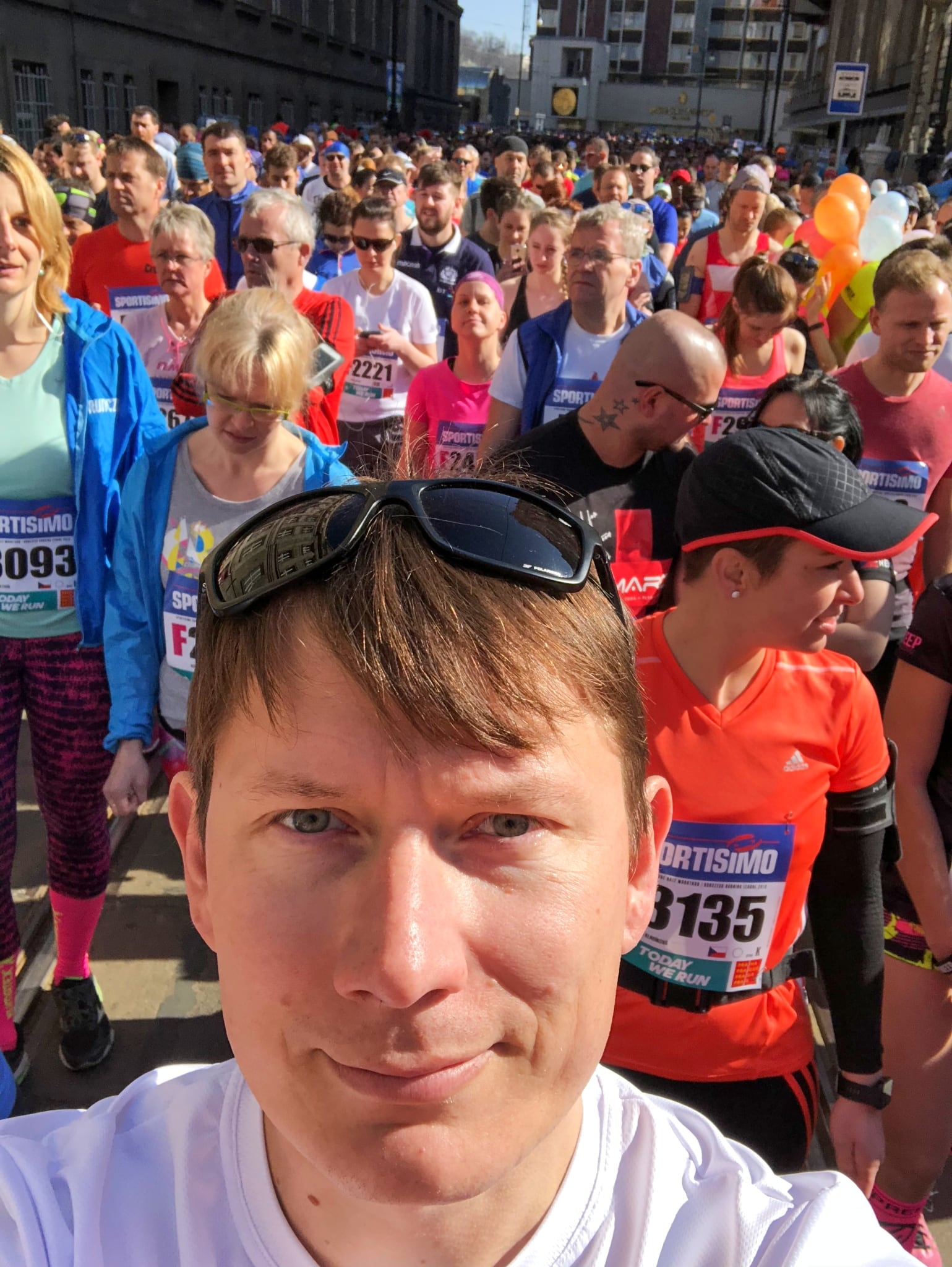 Krátce po deváté potkávám traskovou HR-ku Evu, která pro mě má připravené firemní funkční tričko. O závodu se ví teprve půl roku, tak se to dříve nestihlo, no… Převlékám se, připínám startovní číslo, a po společné fotografii s ostatními „traskáči“ si jdu schovat batoh. Organizace je vážně vymakaná. Dav závodníků už sice výrazně zhoustnul, ale dostatečný počet usměvavých brigádníků řeší vše rychle a s přehledem. Už bez batohu a s mobilem v ruce (kapsička na opasek se po vložení iPhonu rozpadá na prvočinitele) plavu davem a snažím se kormidlovat do prostoru startu. Během plavby potkávám spolupracovnici Katku. Vzájemně se vyfotíme a u hotelu InterContinental se řadíme do startovního pole rozděleného na sektory podle výkonnosti, ale na to si takhle vzadu nikdo nehraje.