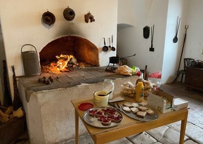 Na Pecku to mám něco málo přes 2 kilometry, to už bych mohl zvládnout. Poslední kopec skrz vesnici až na nádvoří hradu už jedu skoro z posledních sil. Na nádvoří to sice není tak atmosférické, jako když se tady krmíme v noci, ale překvapení po otevření správných dveří do „černé kuchyně“ hradu atmosféru bohatě vynahradí. Tak nějak si představuji ráj! Spousta jídla, pití, lavice k posezení a usměvavý kastelán navrch. Dávám si páreček, chleba s marmeládou, pak další, a ještě jeden. K tomu teplý čaj a banán. A pivo! Mít na čele ukazatel nálady a energie, ručička by viditelně stoupala na maximum. Poprvé během pochodu si sedám a chvilku relaxuju. Ani se mi nechce pryč, ale nakonec se přemluvím. Obzvlášť, když jsem na průběžném pátém místě! Několikrát děkuji za ty dary, pak se loučím a po známé cestě opouštím hrad i vesnici.