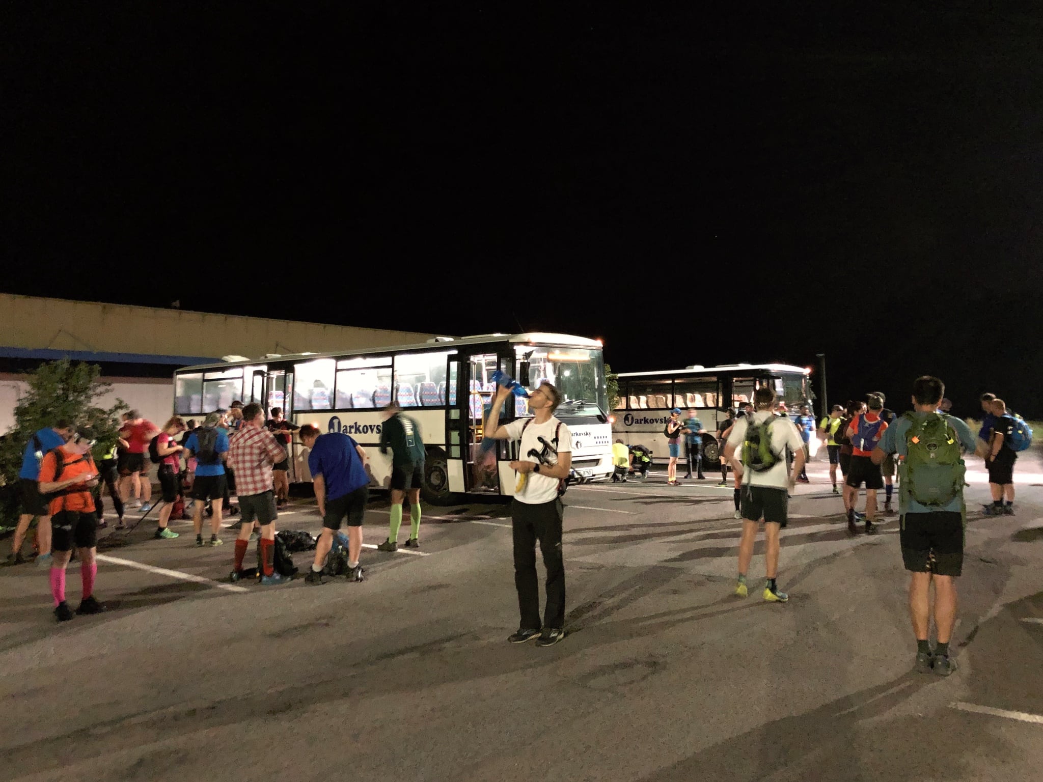 S drobným zpožděním se v úzkých uličkách sídliště objevil první autobus, a za pár okamžiků po něm i druhý. Startu lační pochodníci se začali hrnout dovnitř, já si k cestě zvolil bus číslo 2. Nevím, jak vypadala jednička, ale dvojka měla tak nějak víc nahuštěné sedačky, takže ještě než jsme vyjeli, kolena už byla trochu dřevěná. Ale jsou horší věci na světě, jako když na mě třeba celou cestu táhne z otevřeného okýnka… 🙂 V každém případě jsem byl rád, když jsem se v celku a bez trvalých následků výkulil na vyhřáté parkoviště před nákupákem pár stovek metrů daleko od státní hranice a mohl se konečně protáhnout. Chvilku jsem se prošel po zoroval radostné hemžení, pak ještě jednou pokecal s Evou, a pár minut před jedenáctou spolu s ostatními vyrazil až přímo k hranici, kde byl naplánovaný start. Pár vteřin před startem se ozvalo odpočítávání a s úderem jedenácté večerní hodiny se celé pole dalo do pohybu – je odstartováno!