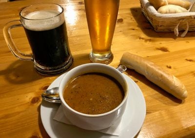 Začíná mi kručet v břiše, proto je dobře, že se blíží další čipová kontrola. Tentokrát je v restauraci, v hotelu Alba, stačí už jen seběhnout jeden kopeček a po krátké cestě po silnici si můžu objednat tradiční snídaňové menu – gulášovku s několika rohlíky, pivo a Kofolu. Pohodlně se uvelebím na dřevěné lavici a začnu doplňovat kalorie. Polévka je výborná, přiměřeně horká a společně s několika rohlíky mě zase postaví na nohy. Během jídla poslouchám výrazný hlas Petra Malého a dalších orgů na kontrole a nabírám sílu na další kilometry. Aktuálně jich mám za sebou 48, na cestě jsem zatím strávil 7 hodin a 45 minut. Tempo tedy nic moc, ale když se k tomu přičtou skoro 2 výškové kilometry, není to tak zlé.