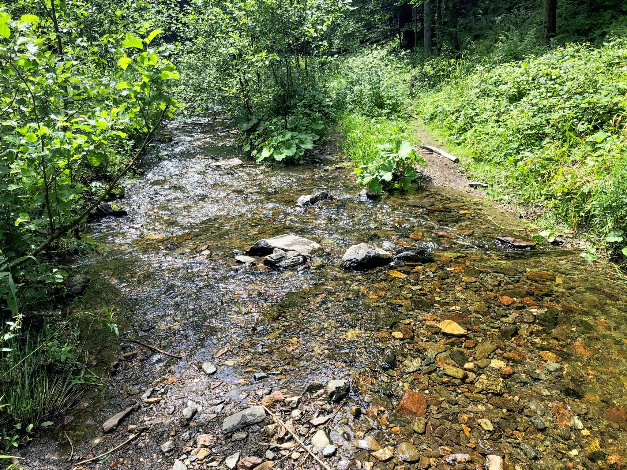 V lese kolem potoka to s horkem není tak zlé, je tu vlastně celkem příjemně. Další brod přes cestu z počátku nevnímám nijak negativně, prostě jen najdu nějaký ten nedaleký strom či kamennou hráz a přeskáču na druhý břeh. Ale když ani po minutě hledání nic podobného nenacházím a pochopím, že tu asi nic takového není, rozmýšlím se, jestli se zouvat, nebo to zkusit přeskákat. Nakonec zvítězí lenost a s trochou štěstí se na druhý břeh dostanu opět v suchu a pohodě. Na druhém brodu se situace opakuje, na tom třetím mě ale štěstí opouští a levá bota je najednou plná vody. Nemám pro Olafa vlídného slova, obzvlášť když se na brodu číslo 4 situace opakuje, jen s tím rozdílem, že tentokrát si naberu do druhé boty. Zbývající brody tedy procházím ne zcela volně, ale bez nějaké zásadní snahy se tomu vyhnout. Naštěstí netrvá dlouho a objeví se přede mnou chatička s velkým K na plotu, kde na mě U Klímů čeká předposlední občerstvení.