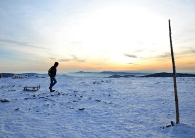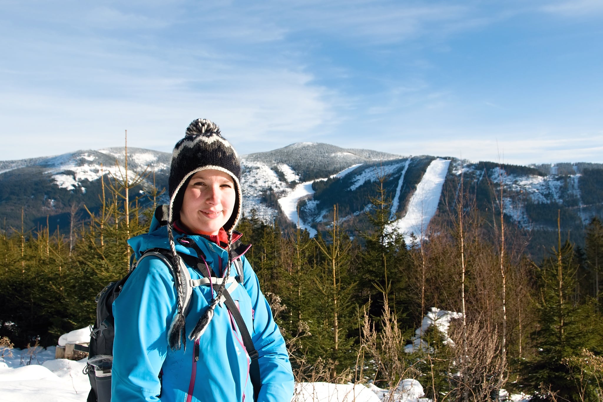 Když míjíme Zbojnickou chatu, bohužel uzavřenou, zbývá nám na vrcholek Králického Sněžníku zhruba pět kilometrů. Pouhých pět kilometrů, dalo by se napsat, ovšem jak se rychle přesvědčíme, bude to zdaleka nejnáročnějších pět kilometrů naší cesty. Hned za chatou je rozcestník, který nás nekompromisně směruje vstříc velmi prudkému kopci s hlubokým, zmrzlým sněhem. Bez častého odpočinku to nejde, a i když výstup měří jen pár stovek metrů, pereme se s ním nepříjemně dlouho. Odměnou za naše úsilí nám jsou další skvělé výhledy do okolí i rozkošné zimní scenérie jako z pohádky, které přímo svádí k focení.