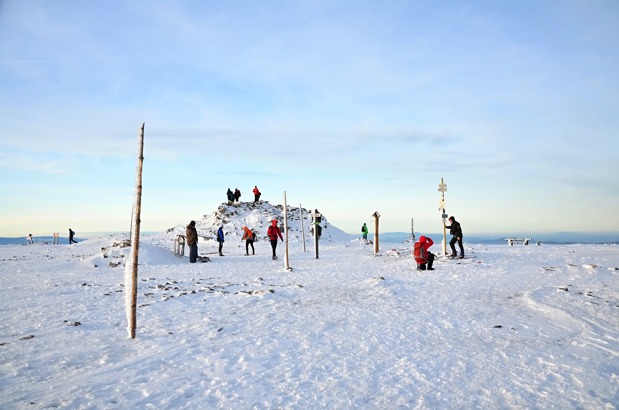 Drobným zpestřením náročné cesty je trasa vedoucí přesně po státní hranici. Před čtvrt stoletím bychom se v těchto místech zcela určitě nevyhnuli nezapomenutelnému setkání s neúnavnými ochránci socialistického blahobytu, dnes nás tu vítají pouze červeno-bílé hraniční patníky a občas nějaká ta výstražná cedule. Sněhu je tolik, že některé patníky jsou zcela zasypány; z toho odhadujeme, že sněhu je tu kolem půl metru. Už tak nepříjemné brodění se přechází ve smrtící závěrečné stoupání na samotný vrchol. Teprve posledních pár stovek metrů vede společně se zelenou značkou, očividně hojně využívánou z polské strany. Sníh je proto ušlapán v širokou cestu, a tak se za pár minut konečně dostáváme na vrchol.