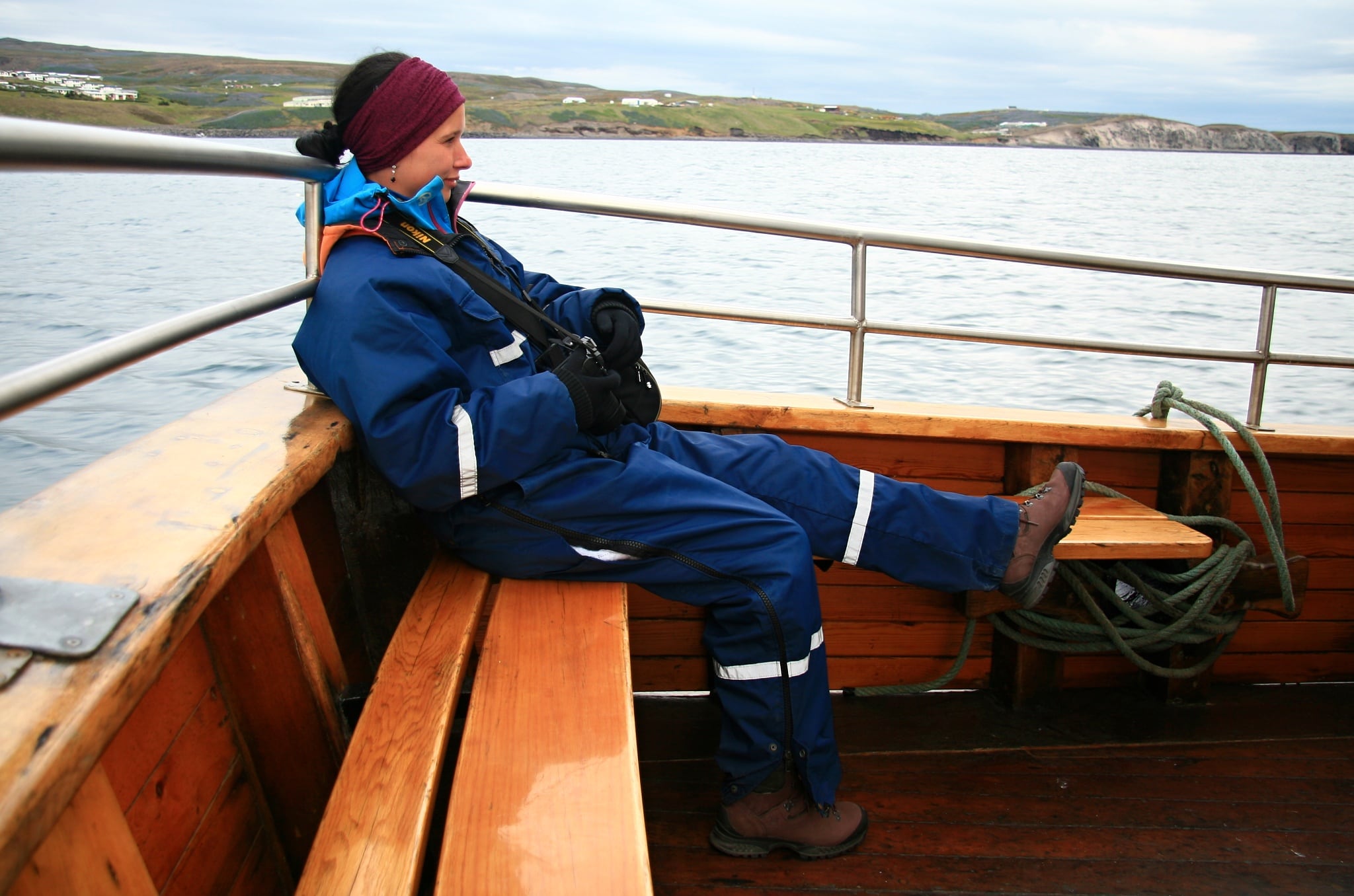 Přístav Húsavík představuje jedno z nejlepších míst v zemi pro pozorování velryb a městský rozpočet je dnes velmi závislý na letních příjmech plynoucích z poznávacích výprav. Pravděpodobnost spatření velryb se pohybuje jen těsně pod stoprocentní hranicí a klidné mysli turistů bezesporu pomáhá i příslib společnosti, že pokud bude výprava neúspěšná, budou mít všichni na palubě ještě jeden pokus. My se za velrybami vydáváme na naftou poháněné lodi pokřtěné na Bjössi Sör, na kterou se kromě nás vměstnala zhruba dvacítka turistů a několik členů posádky. Před vyplutím dostane každý záchrannou vestu a neforemný, ale zatraceně praktický modrý overal. Jakmile si ho oblečeme, kapitán nastartuje motor a pomalu odrážíme od břehu. A kromě vzrušení z nadcházejícího dobrodružství nás těší ještě jedna věc – přestalo pršet.