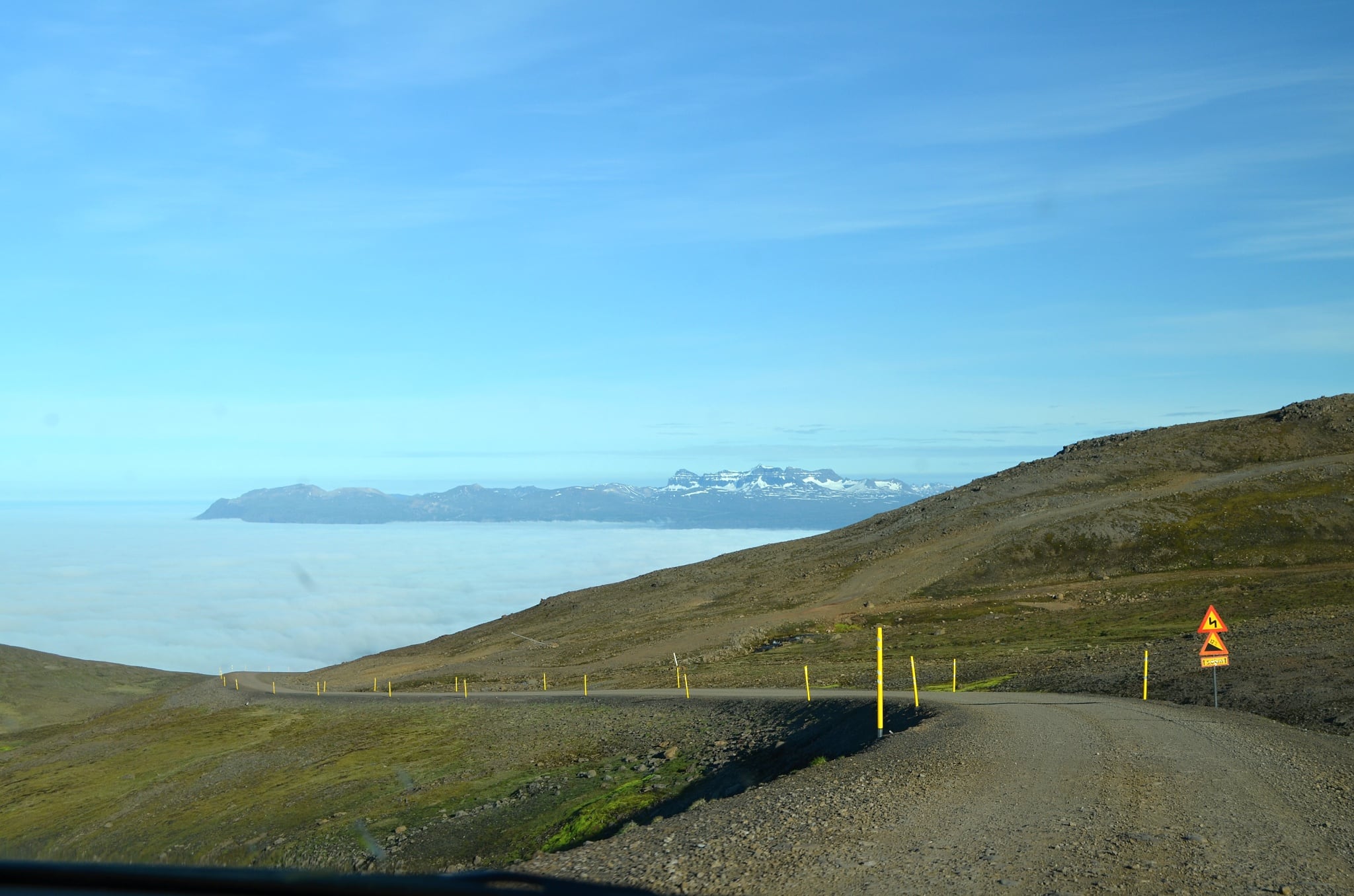 Jedno z mála zpestření na cestě na nás čeká asi v polovině cesty od kaňonu, kde musíme překonat takový malý horský hřebínek. Silnice se klikatí jak zběsilá a slabší povahy mohou při pohledu z okýnka dostat i závrať. Na cestě nahoru je viditelnost skvělá, po přejezdu hřebenu na nás kromě zamotané silnice čeká i mlha; naštěstí je viditelnost dostatečná pro bezpečnou jízdu. Pozvolným tempem se spoustou přestávek na obdivování krás Islandu jsme se dostali do oblasti Fljótsdalshérað se stejnojmenným městečkem ve středu, kde pozvolna začínáme přemýšlet nad dnešním noclehem. Z rozjímání nás vyruší mobilní telefon. Islandské číslo. Hanka ho zvedne a v telefonu se ozve majitel penzionu Dyngja s otázkou, jestli dorazíme na domluvené přespání. Po chvilce nechápavého ticha si uvědomíme, že ubytování na dnešek v přístavním městečku Höfn skutečně máme domluveno. Bohužel nám k němu zbývá ještě asi 200 kilometrů.