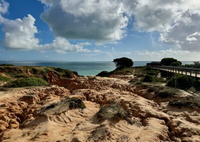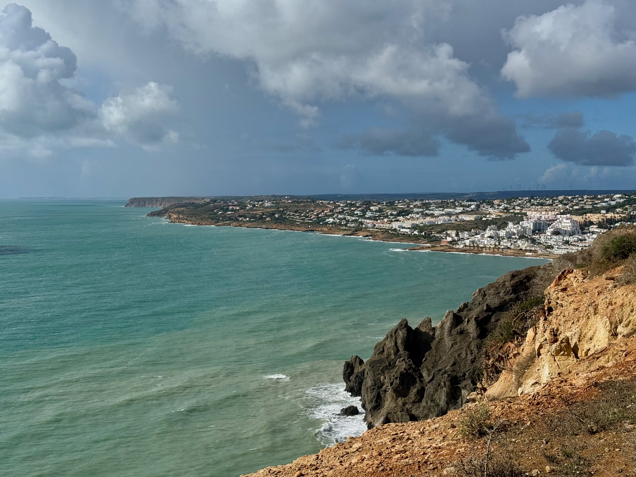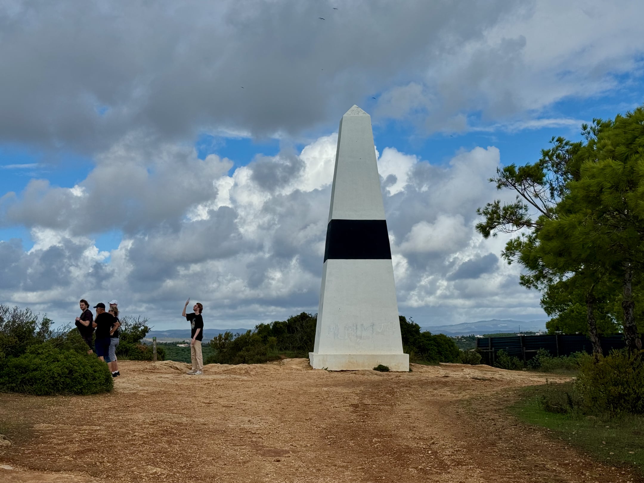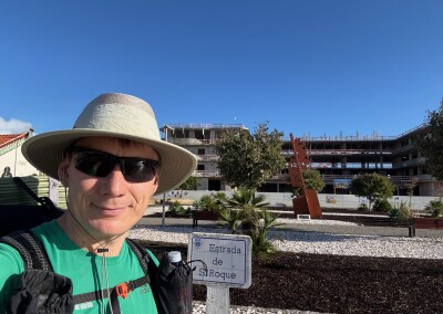 Na obzoru na mě vykoukne městečko Luz. A také šedé a těžké mraky, plné vody. Na některých místech už očividně prší, u mě je to naštěstí zatím bez deště. Trasa mě na pár minut svádí od moře do vnitrozemí. Obrovský betonový hranol značí vrchol kopce Atalaia tyčící se do nadmořské výšky 109 metrů! Musím si to vyfotit, výš se dneska už nepodívám. Pak se ale trasa zase stáčí a za chvilku jsem na pláži.