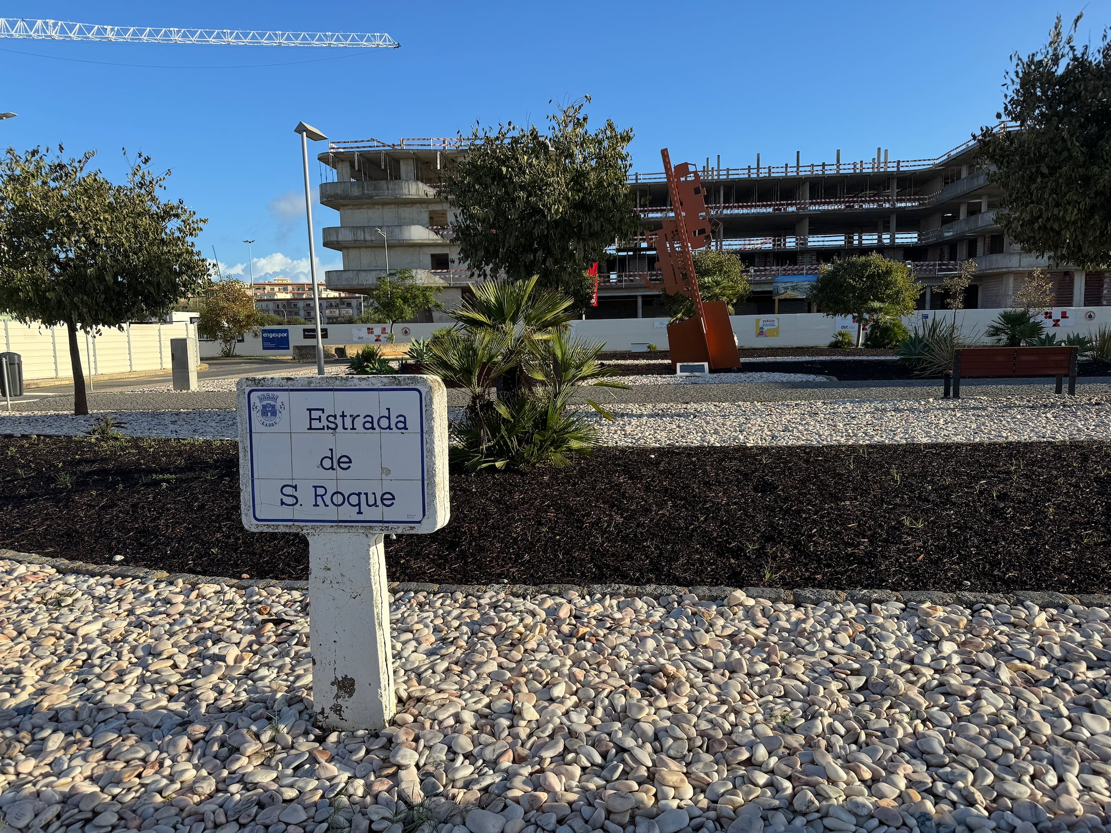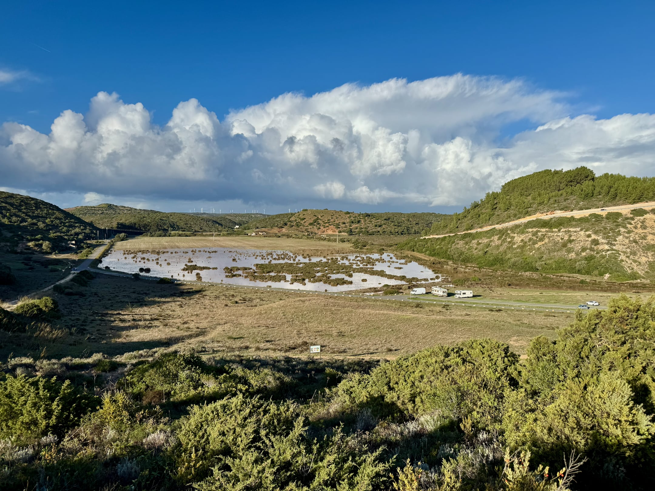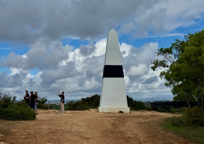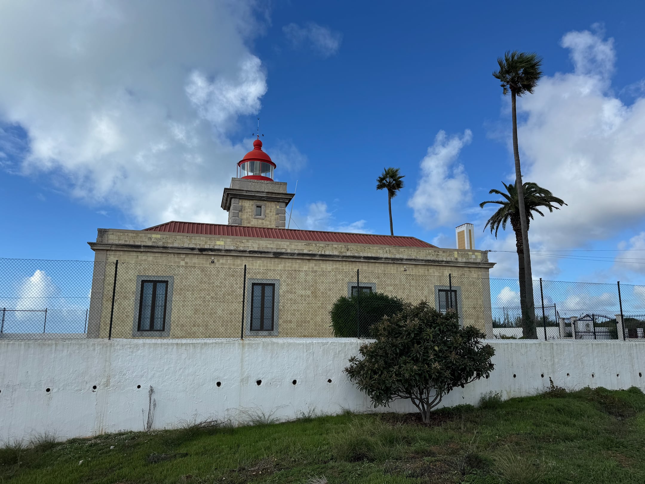 Na obzoru na mě vykoukne městečko Luz. A také šedé a těžké mraky, plné vody. Na některých místech už očividně prší, u mě je to naštěstí zatím bez deště. Trasa mě na pár minut svádí od moře do vnitrozemí. Obrovský betonový hranol značí vrchol kopce Atalaia tyčící se do nadmořské výšky 109 metrů! Musím si to vyfotit, výš se dneska už nepodívám. Pak se ale trasa zase stáčí a za chvilku jsem na pláži.