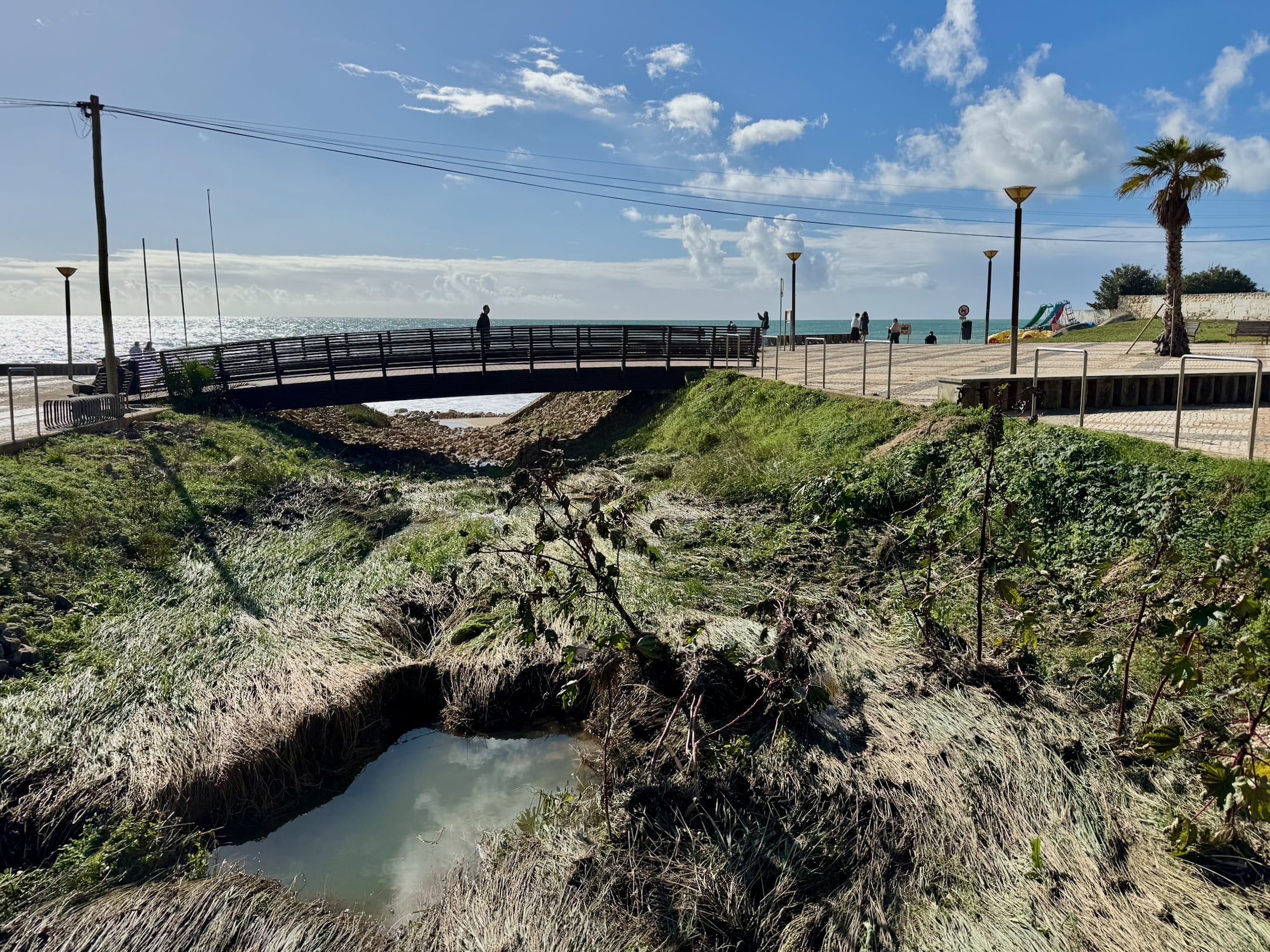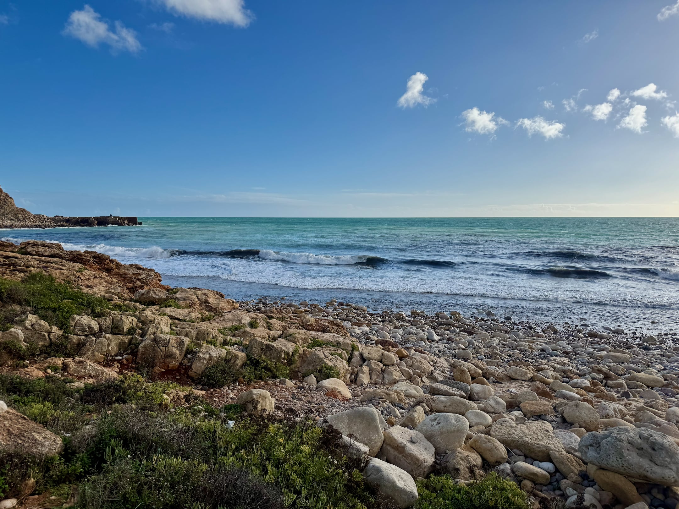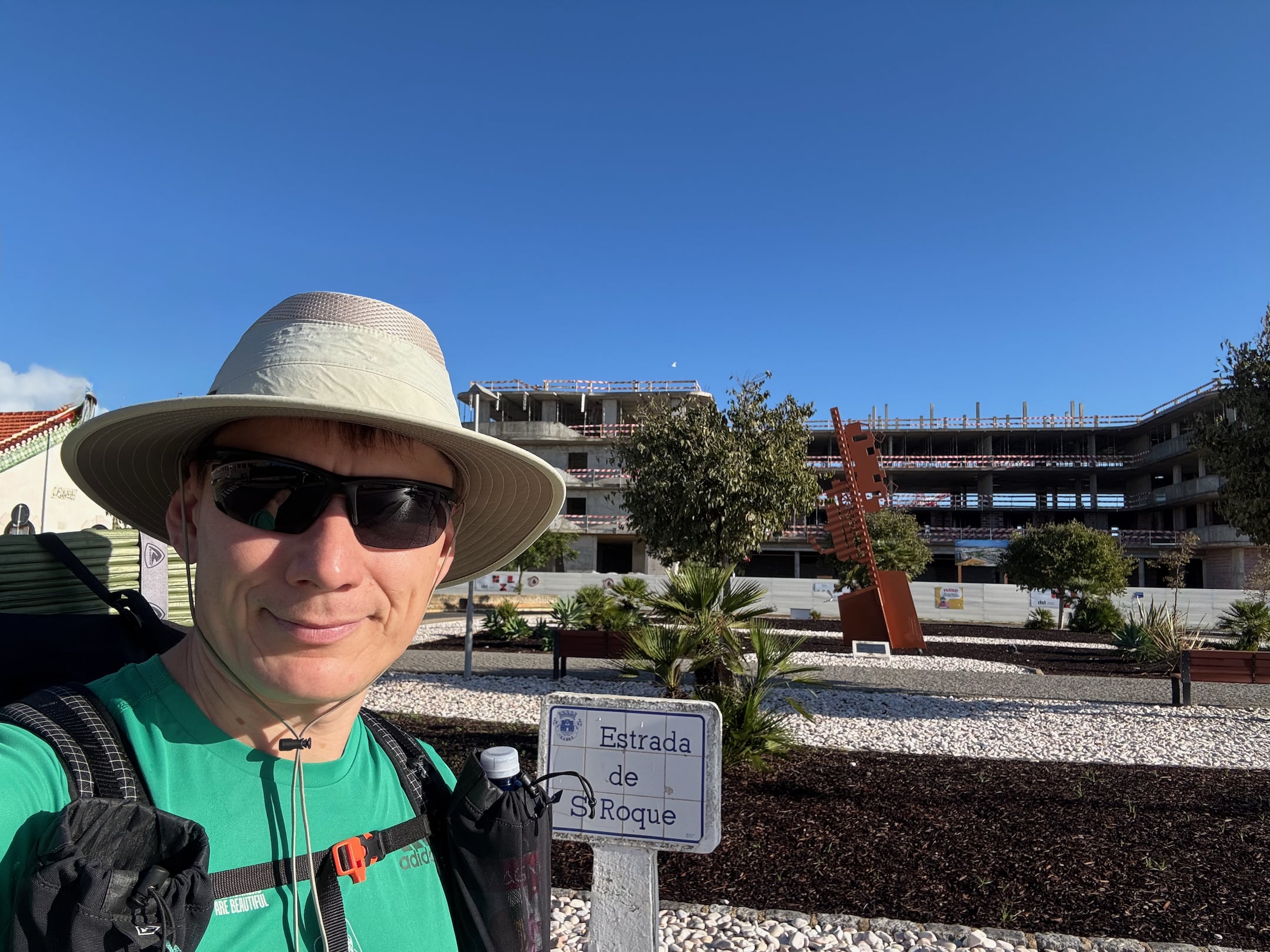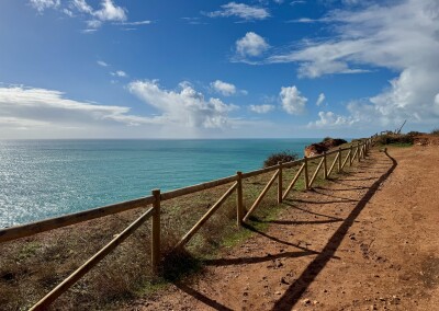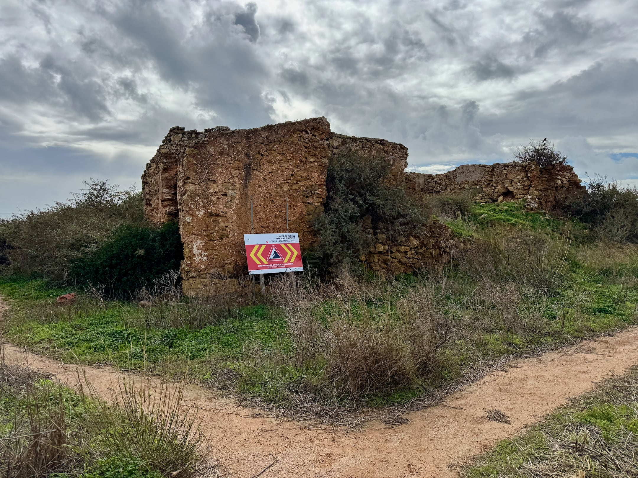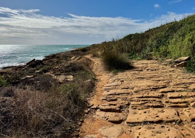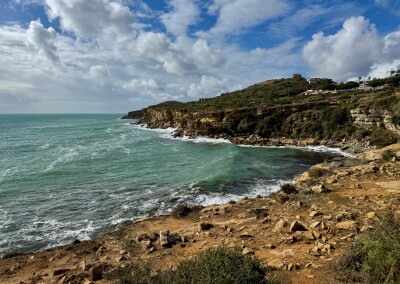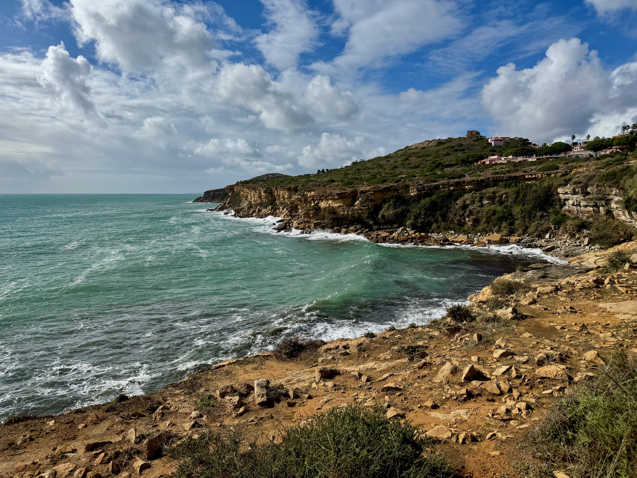 Na dnešním 21. kilometru obcházím honosnou vilu na břehu moře, a o kousek dál si fotím další polorozpadlou pevnost, tentokrát jménem Forte de São Luís de Almádena. Následující sestup do delty řeky k pláži jménem Boca do Rio (což přeloženo znamená ústí řeky:) mě docela protáhne, a jako bonus si dám cestu po skále nad mořem, abych se nemusel zouvat. Má tu být i nějaké archeologické naleziště z doby starého Říma, ale nějak nemám náladu koukat na další zříceniny, tak si jen vyfotím moře a začnu šplhat na protější sráz.