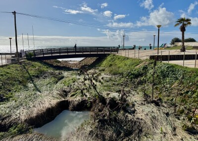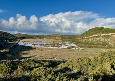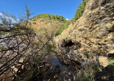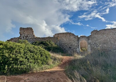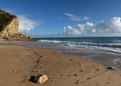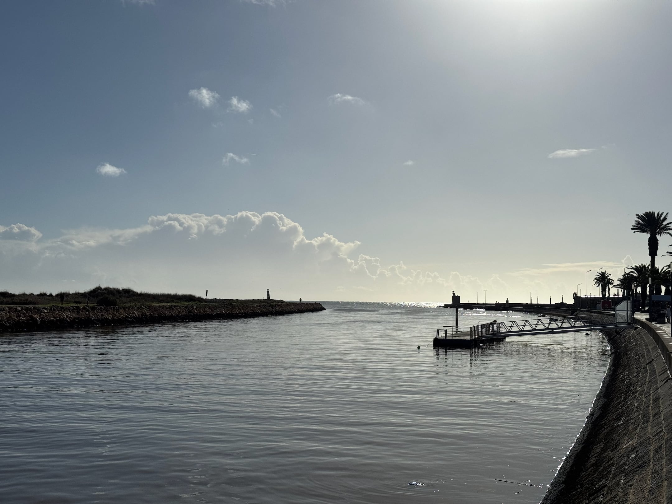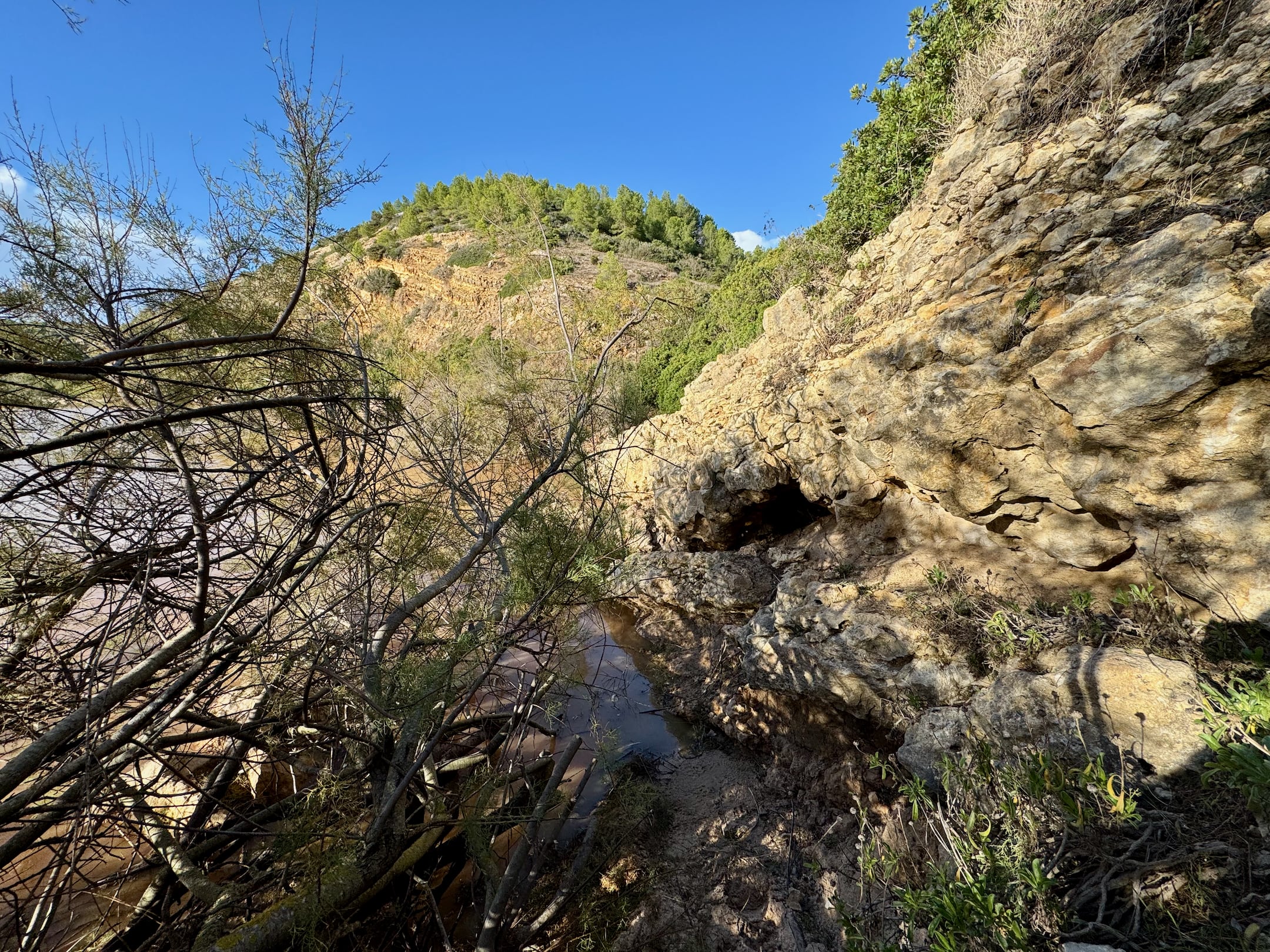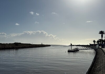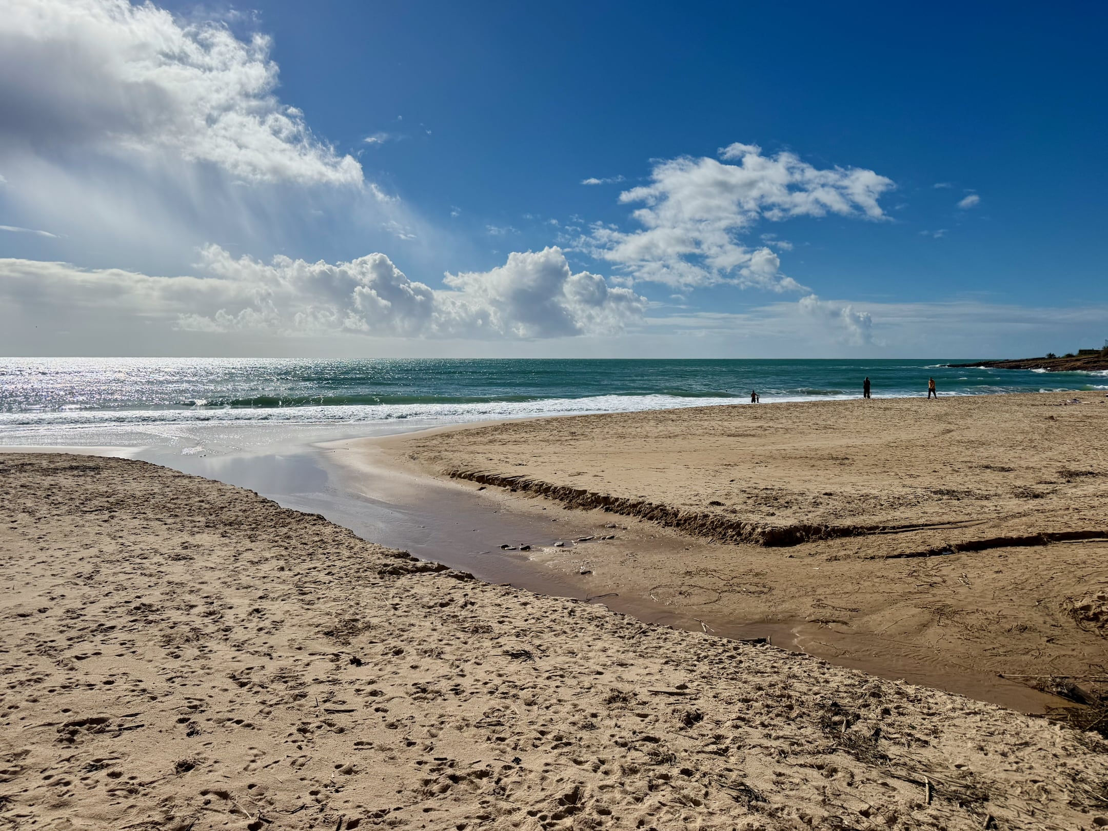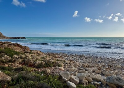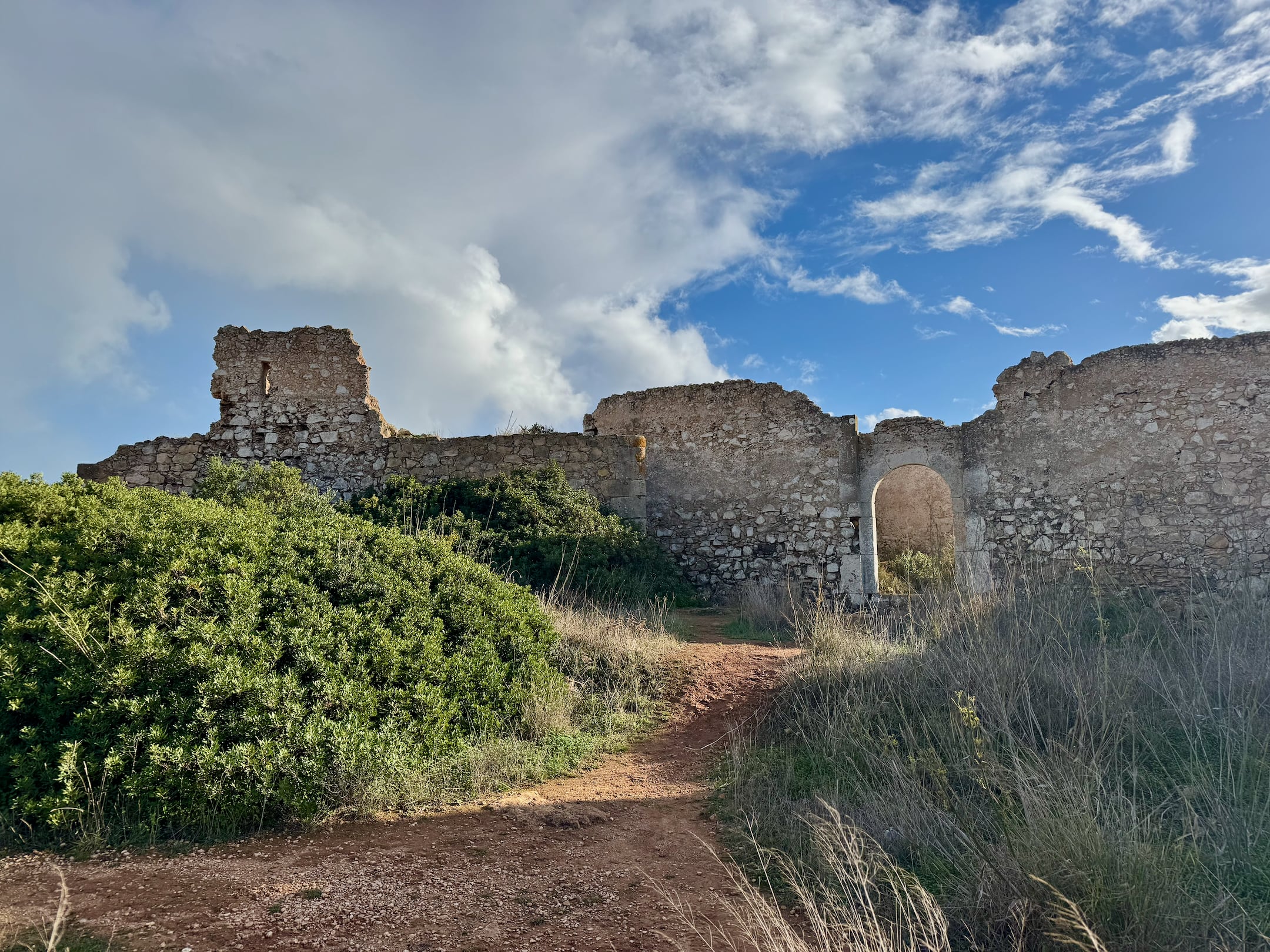Na dnešním 21. kilometru obcházím honosnou vilu na břehu moře, a o kousek dál si fotím další polorozpadlou pevnost, tentokrát jménem Forte de São Luís de Almádena. Následující sestup do delty řeky k pláži jménem Boca do Rio (což přeloženo znamená ústí řeky:) mě docela protáhne, a jako bonus si dám cestu po skále nad mořem, abych se nemusel zouvat. Má tu být i nějaké archeologické naleziště z doby starého Říma, ale nějak nemám náladu koukat na další zříceniny, tak si jen vyfotím moře a začnu šplhat na protější sráz.