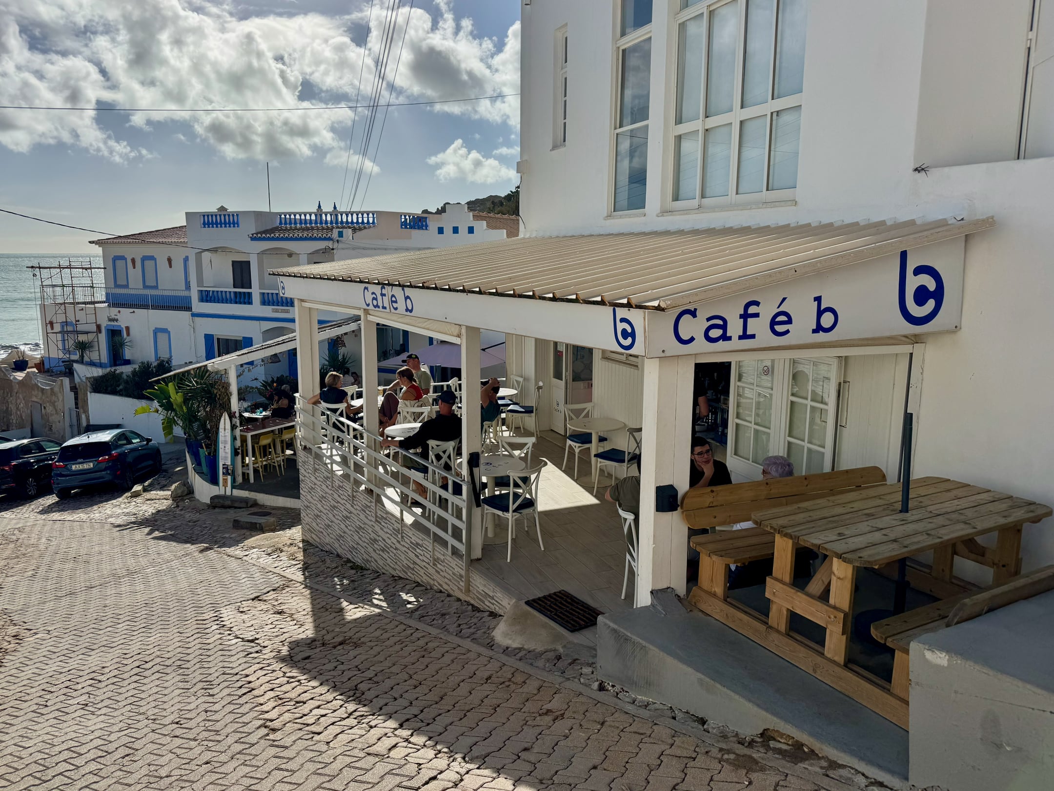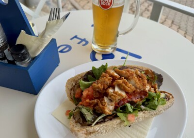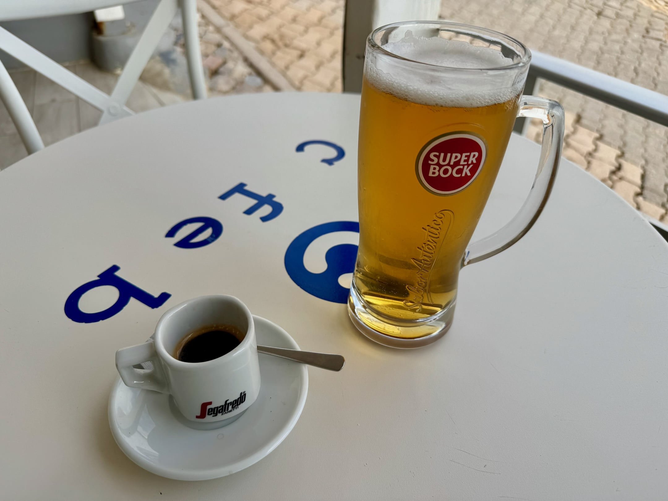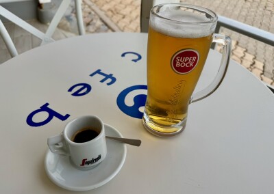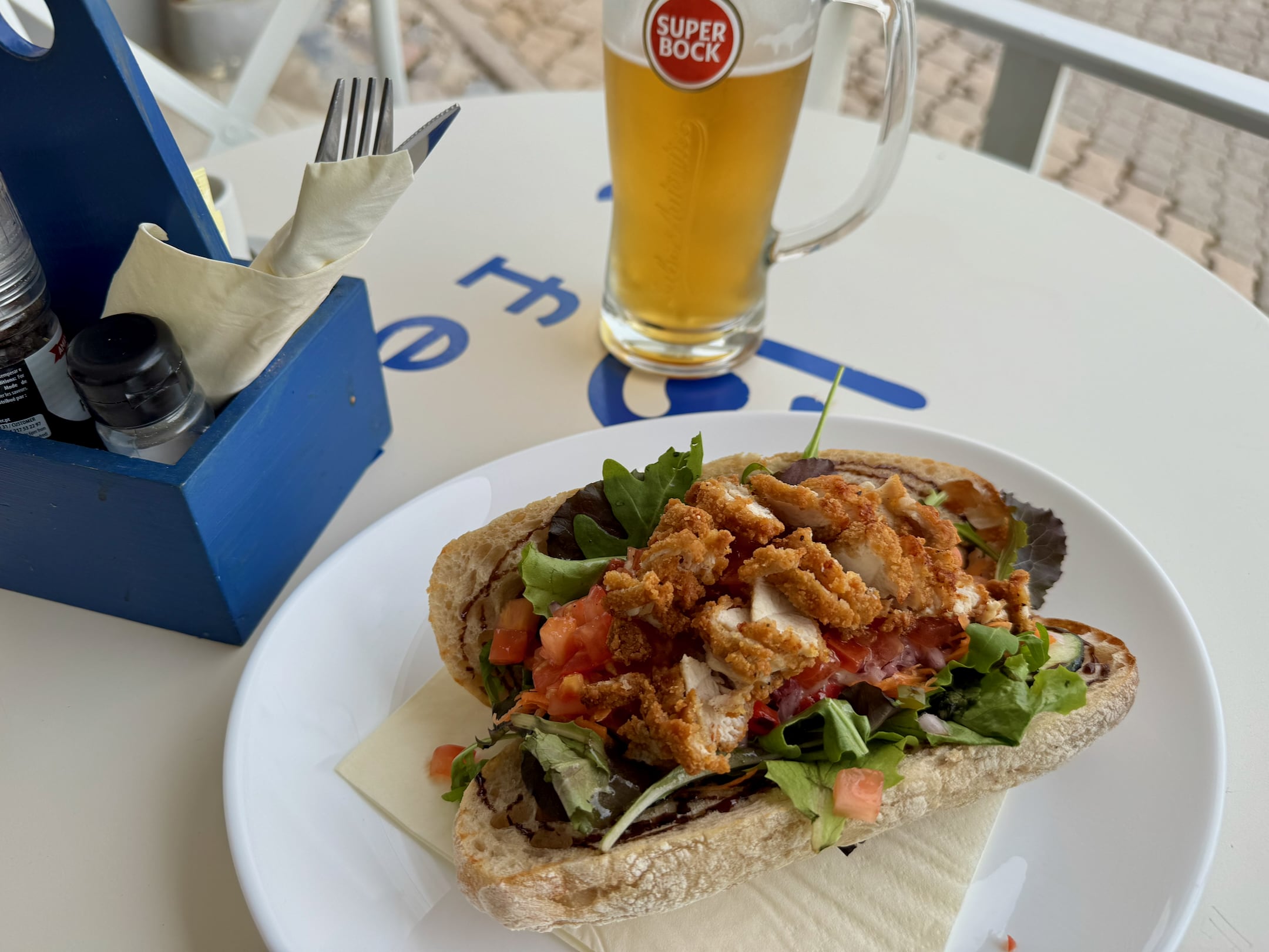 Nad malým městečkem Burgau chvíli obdivuju pozůstatky pevnosti zničené při velkém zemětřesení v listopadu roku 1755, ale pak dostanu hlad a z prudkého kopce seběhnu k moři, kde na mě v kavárně Café b čeká hezké volné místo na terase. Objednávám si kafe, sendvič s kuřetem a samozřejmě pivo. A pak ještě druhé, pro jistotu.