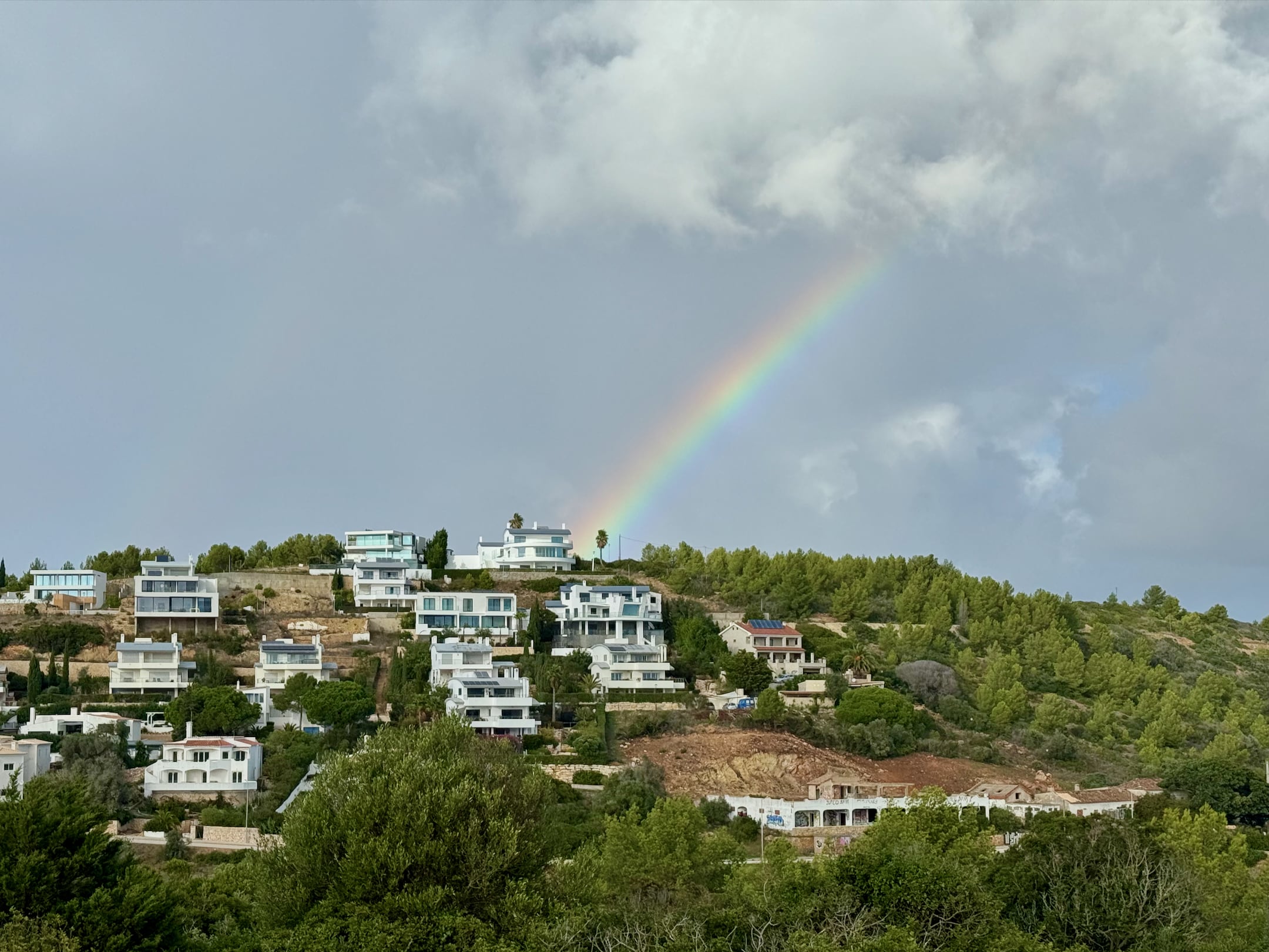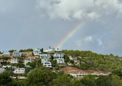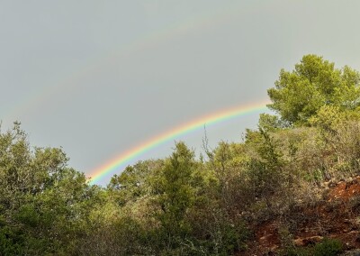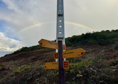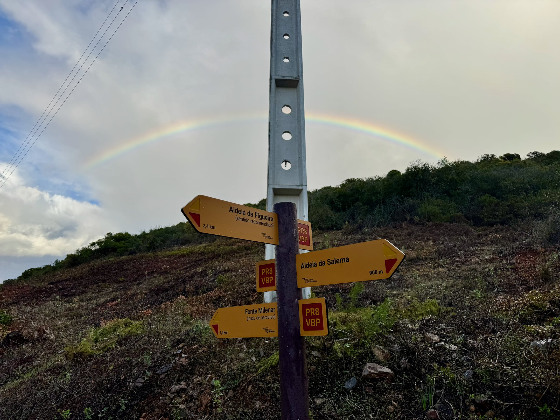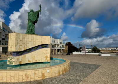 V 9:15 vyrážím na start. Rychle se vracím již prozkoumanou trasou na náměstíčko se začátkem treku, kde páchám nezbytné selfí, pouštím záznam na hodinkách a bez zbytečného zdržování vyrážím na trasu. Teď už oficiálně. Kochám se, nahřívám ve slunečních paprscích a je mi fajn. Po břehu kanálu mířím na na jihovýchod, sluníčko mi svítí do očí. Ale stále častěji se schovává za mráčky. Jako správný turista si fotím kostel sv. Marie a o kousek dál i pevnost Ponta da Bandeira. Nad sochou sv. Gonçalo vykvetla nádherná duha, díky které mě o pár minut později osvěžil první krátký deštík. Ale nic, co by stálo za pozornost.