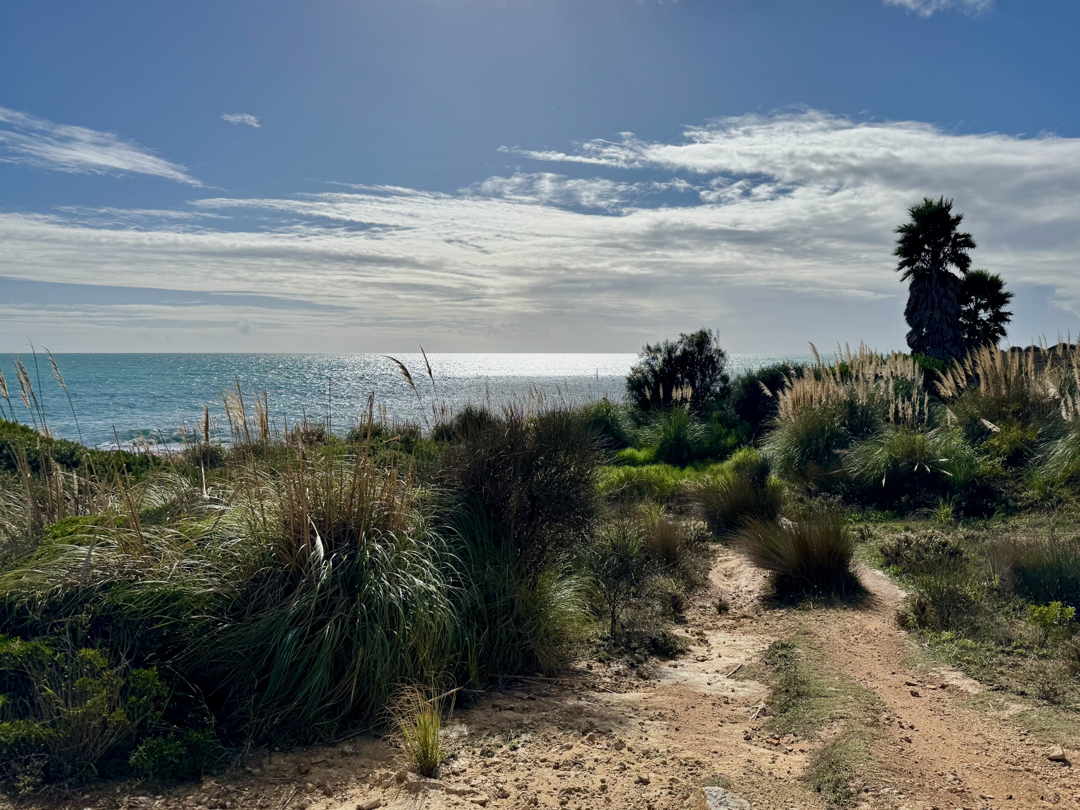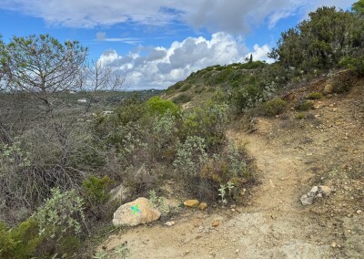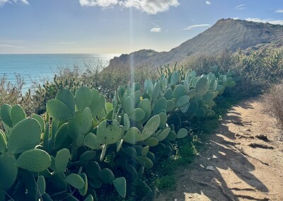 Vyšplhám pár desítek výškových metrů na útes, to abych měl lepší výhled, a pak jdu zase skoro po rovině kamenitým a písčitým terénem mezi keříky. Kolem mě rostou kaktusy a opuncie, občas na mě vykoukne i nějaká ta barevná kytička. Některé úseky jsou technicky obtížnější, ale z pohledu celkem pravidelného účastníka Olafových pochodů nic extra náročného. Sluníčko stále pálí, za mraky se schová jen výjimečně.