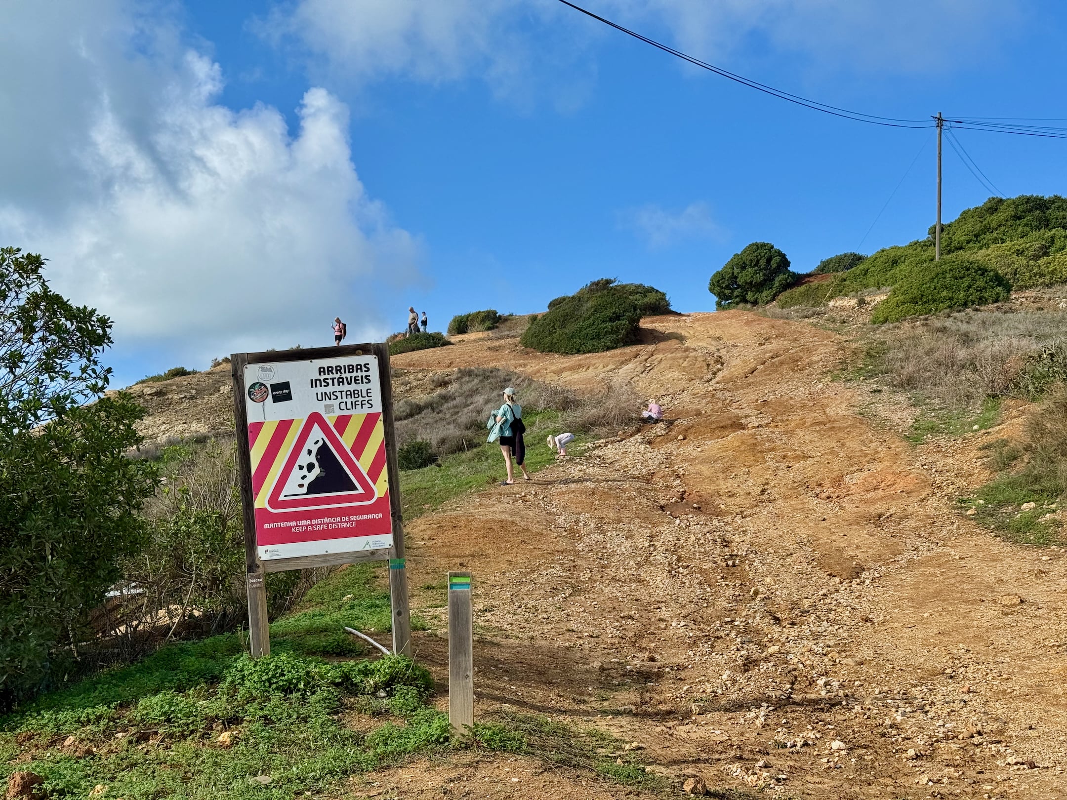 Po prvním blízkém setkání s pískem a mořem mě značení žene do kopce. Dohromady má jen pár desítek metrů, ale Fishermen’s Trail není zrovna vysokohorská turistika. Za celých 8 dní tady papírově nastoupám to samé, co na Tenerife za den jediný. Ke slovu poprvé přijdou trekové hole, ale než se stačím zapotit, jsem nahoře. Velká cedule mě varuje před pádem z útesu, ale jinak se mi zdejší způsoby líbí – žádné zakázané stezky, žádné bariéry (až na vzácné výjimky), žádní nepříjemní strážci. Prostě jsme tě varovali a jestli budeš dělat blbosti a spadneš, můžeš si za to sám…