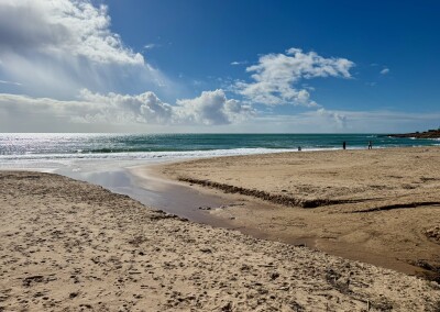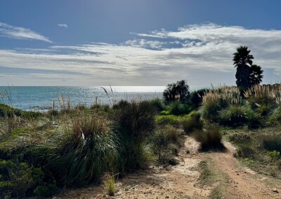 Mám za sebou asi 12 kilometrů, kráčím už 150 minut více méně v kuse. Je načase udělat si malou přestávku. Kavárny na pobřeží jsou nějaké přeplněné, tak si jen koupím pití a uvelebím se na lavičce s luxusním výhledem na moře. Doplňuji vodu a kalorie a vyhřívám se na sluníčku. To pálí tak, že se před odchodem rozhodnu raději namazat – nechci dopadnout jak na Tenerife