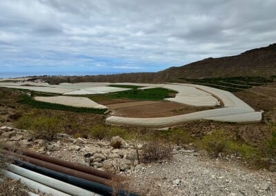 Po překročení dálnice táhnoucí se téměř kolem celého ostrova se naštěstí situace uklidní a já už v poklidu ukrajuju první kilometry a desítky výškových metrů. Do kroku mi cinkají kovové hroty trekových hůlek, které jsem si tentokrát vzal na pomoc s sebou, a já se začínám potit. Sluníčko je sice schované za mraky, ale není úplně zima a navíc je dost vlhko. Kráčím po okraji velké kaldery zvané Králova kaldera (Caldera del Rey), kde se aktuálně pěstují ve velkém banány. Proti sluníčku se vesměs chrání průsvitným plátnem, takže plantáž z dálky vypadá jako velká hnědá, trochu podivná plocha. Na delší dobu poslední větší výdobytek civilizace je pak nějaká čistička vody či odsolovací zařízení na okraji kaldery, ke kterému vede spousta sloupů elektrické energie a jezdí jeden kamión za druhým.