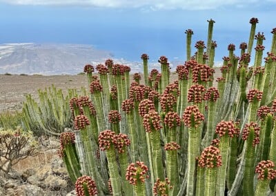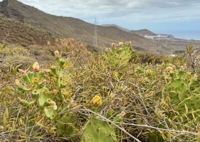 Zhruba po dvou hodinách od opuštění hotelu nalézám první zeleno-bílou značku značící výstup na kopec Roque del Conde. Tento 1001 metrů vysoký krasavec bude mojí první vážnější zkouškou. Stoupání je často kolmo na vrstevnice, mé tempo s plnou krosnou osciluje mezi 2 a 3 kilometry v hodině. Potím se čím dál tím víc, mimo jiné proto, že sluníčko stále častěji vykoukne zpoza mraků a pálí a pálí a pálí. Ještěrky se mi smějí, občas mě laškovně popíchne některý z kaktusů, prostě taková kanárská idylka. Poslední úsek stoupání je nejhorší, je to vlastně taková dlouhá chůze do schodů se zátěží. Ještě, že jsem před dovolenou tuto aktivitu trénoval v posilovně! Za 45 minut jsem nahoře a můžu si kromě dechberoucích výhledů dopřát i příjemné osvěžení v podobě studeného vánku vanoucího od moře.