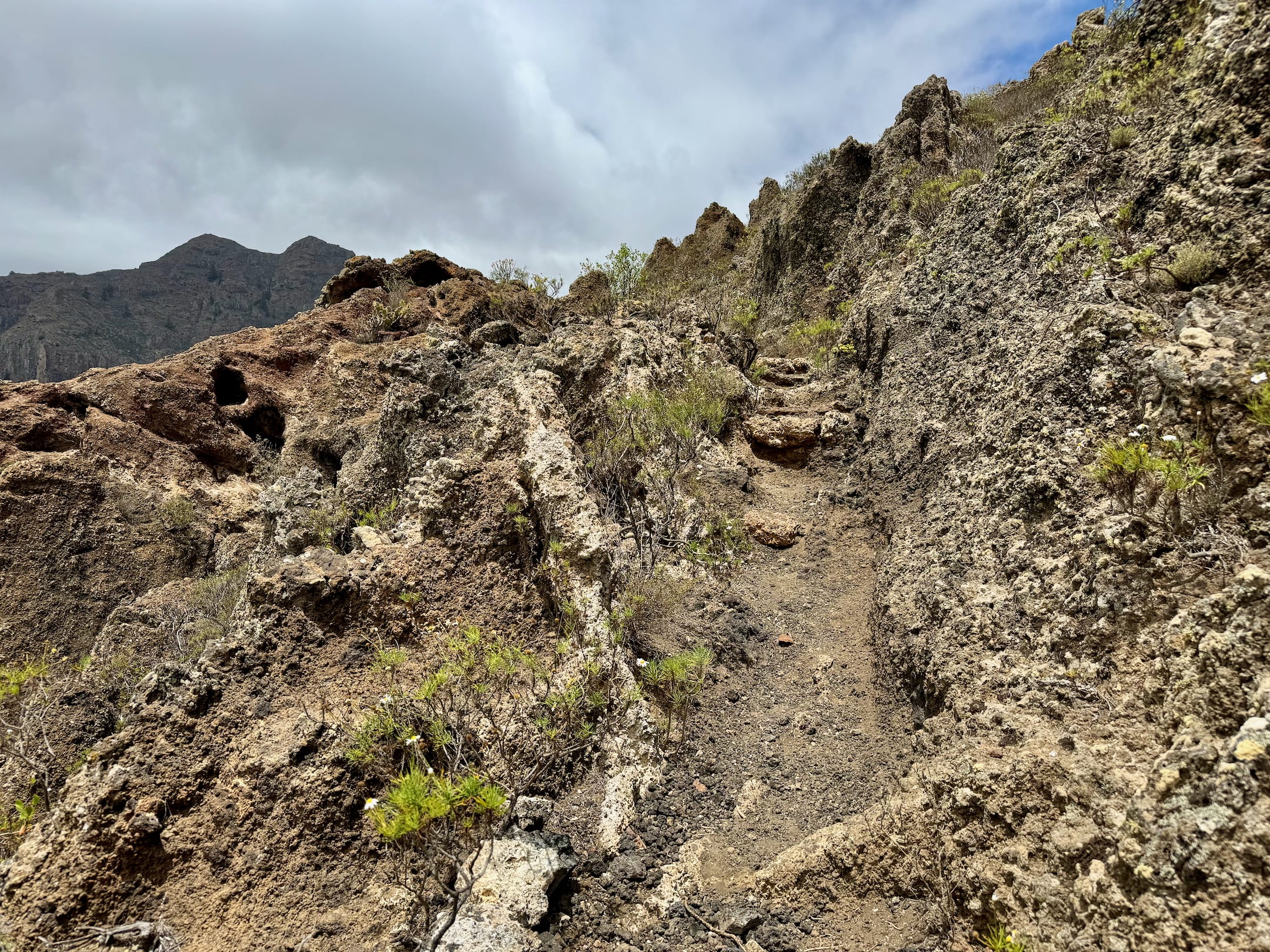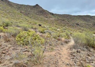 Stále stoupám, následující dny to jiné nebude. Cesta je sice dobře vidět, ale jsou tu vyšlapány i další různými směry, takže čas od času nejdu úplně podle plánu. Někdy se to dá další cestičkou srovnat, jindy se musím vrátit. Po nějaké době si všimnu nepravidelných bílých skvrn na kamenech – podle všeho je to místní značení té „správné“ stopy. Od tohoto okamžiku se mi navigace trochu zjednoduší a bloudím výrazně méně. Jen občas se mezi kamením mihnoucí se ocásek mě trochu znervózňuje, jestli něco nemusím, tak jsou to hadi. Naštěstí se ukáže, že jedinými obyvateli zdejších kopců jsou různé druhy ještěrek, vesměs velmi plachých. Některé jsou dokonce endemické, tedy bydlí jen na Tenerife nebo Kanárských ostrovech.