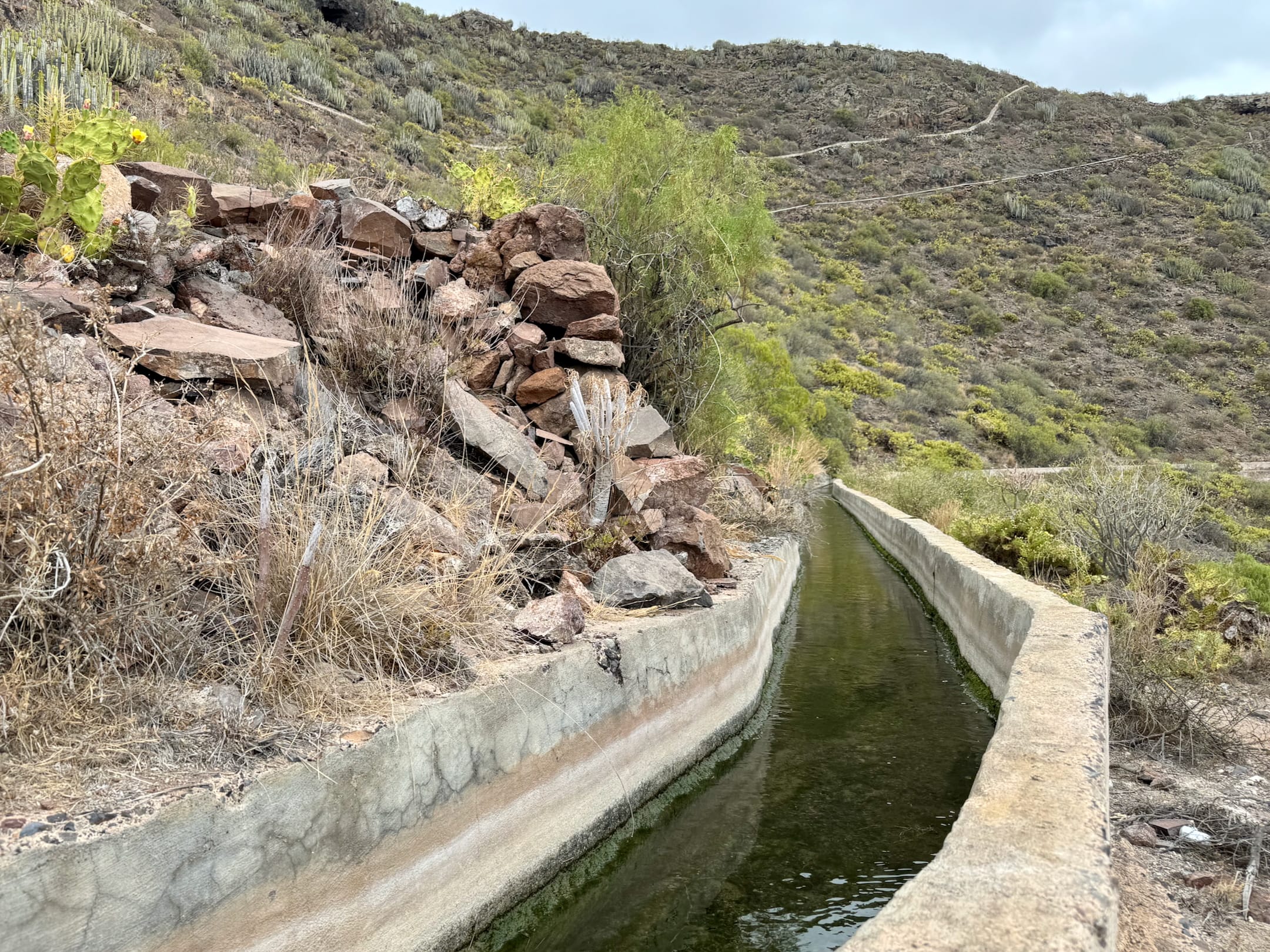 Za průmyslovým podnikem končí kromě dalších výdobytků civilizace i asfaltová silnice, dál už vede pěkný trailík. Hned na jeho počátku potkávám jednoho turistu s batůžkem a jednu běžkyni, na dlouhou dobu poslední. Cestička je docela široká a vyšlapaná, což ocením především při pohledu na dlouhé trny různých kaktusů, opuncií a dalších na pohled sice pěkně kvetoucích, ale malinko nebezpečných rostlinek. Kromě různorodých zástupců místní, často endemické flóry mě zaujme taková dlouhá, světlá linka vinoucí se podél kopce hned v několika úrovních. Co by to tak mohlo být…? O pár stovek metrů dál už jsem moudřejší, jedná se o akvadukt vedoucí krásně čirou a chladnou vodu! Na pití mám sice ještě zásob dost, ale tak se alespoň trochu opláchnu, k plné aklimatizaci mám ještě hodně daleko a teplo je stále vražednější.