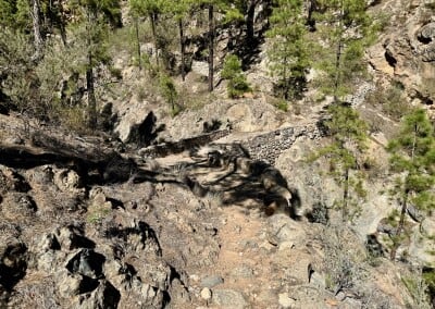 Místní borovice se stávají stále mohutnější a mohutnější, a při té příležitosti si všimnu, že je kůra většiny z nich černá sazemi, jakoby spálená. Lesní požáry tady podle všeho nejsou výjimečné, jen ten loňský se asi trochu vymknul kontrole. Na nečekaných místech se také čas od času vynoří terasovitá políčka, na první pohled ale většina z nich není zrovna udržovaná. Jinak není aktuální úsek moc náročný, sice stále stoupám k výšinám, ale stezka je výborně značená, a abych se neztratil ani kdybych chtěl, je vyznačena ještě kameny po stranách.